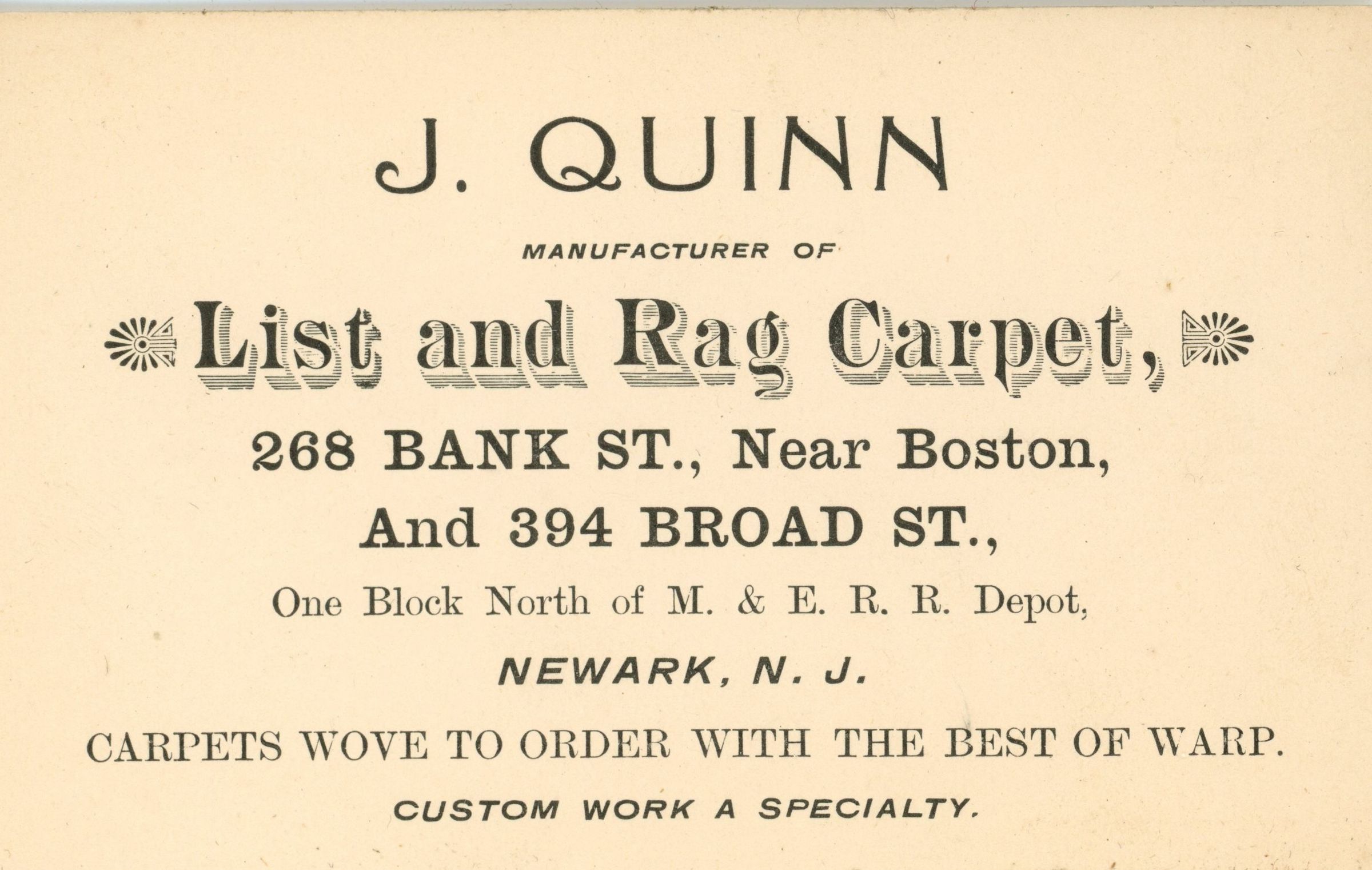 Advertising cards from the Bosworth collection of ephemera. J. Quinn, Manufacturer of List and Rag Carpet, 268 Bank Street, Near Boston and 394 Broad Steet, One Block North of M. & E.R.R. (Morris and Essex Railroad) Depot, Newark, N.J. Carpets Wove to Order with the Best of Warp. Custom Work a Specialty (2 copies).