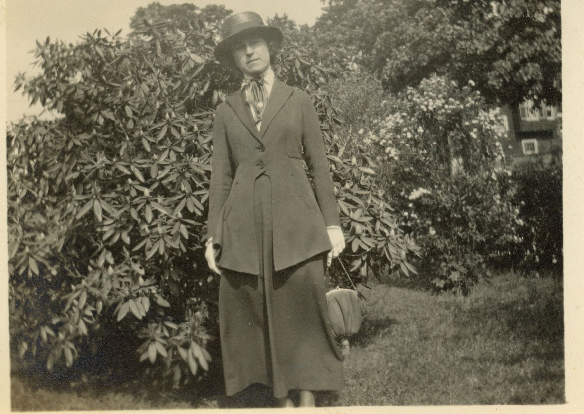 Photograph of Bessie Bosworth standing in a yard wearing traveling clothes.Acquisition