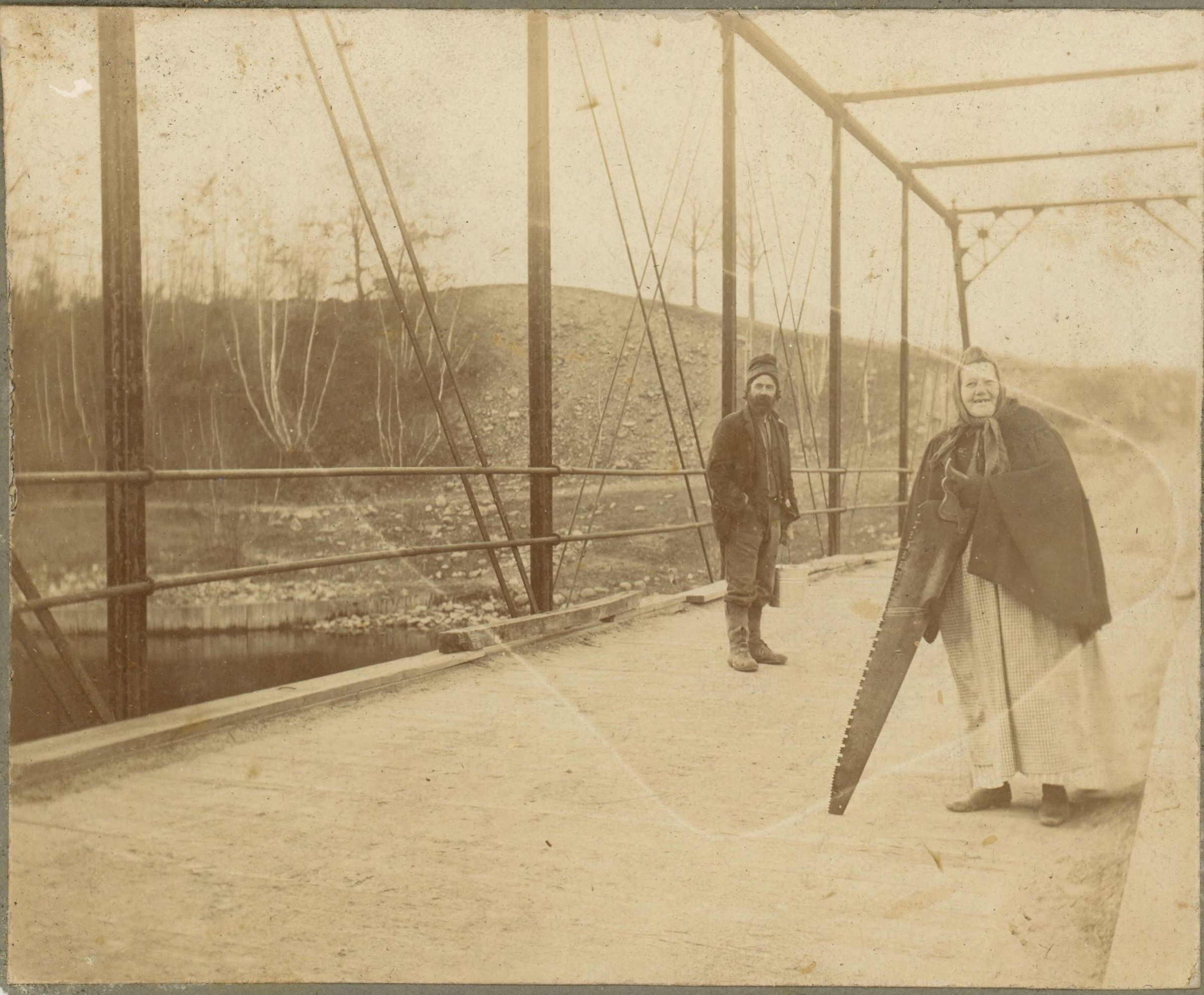 Mysterious photograph of a woman on a bridge holding an enormous saw, while a man looks on. Both sitters appear to be wearing clothes from Eastern Europe. Niether the sitters not the context for this image are identified. It may be a gag photograph.Collection