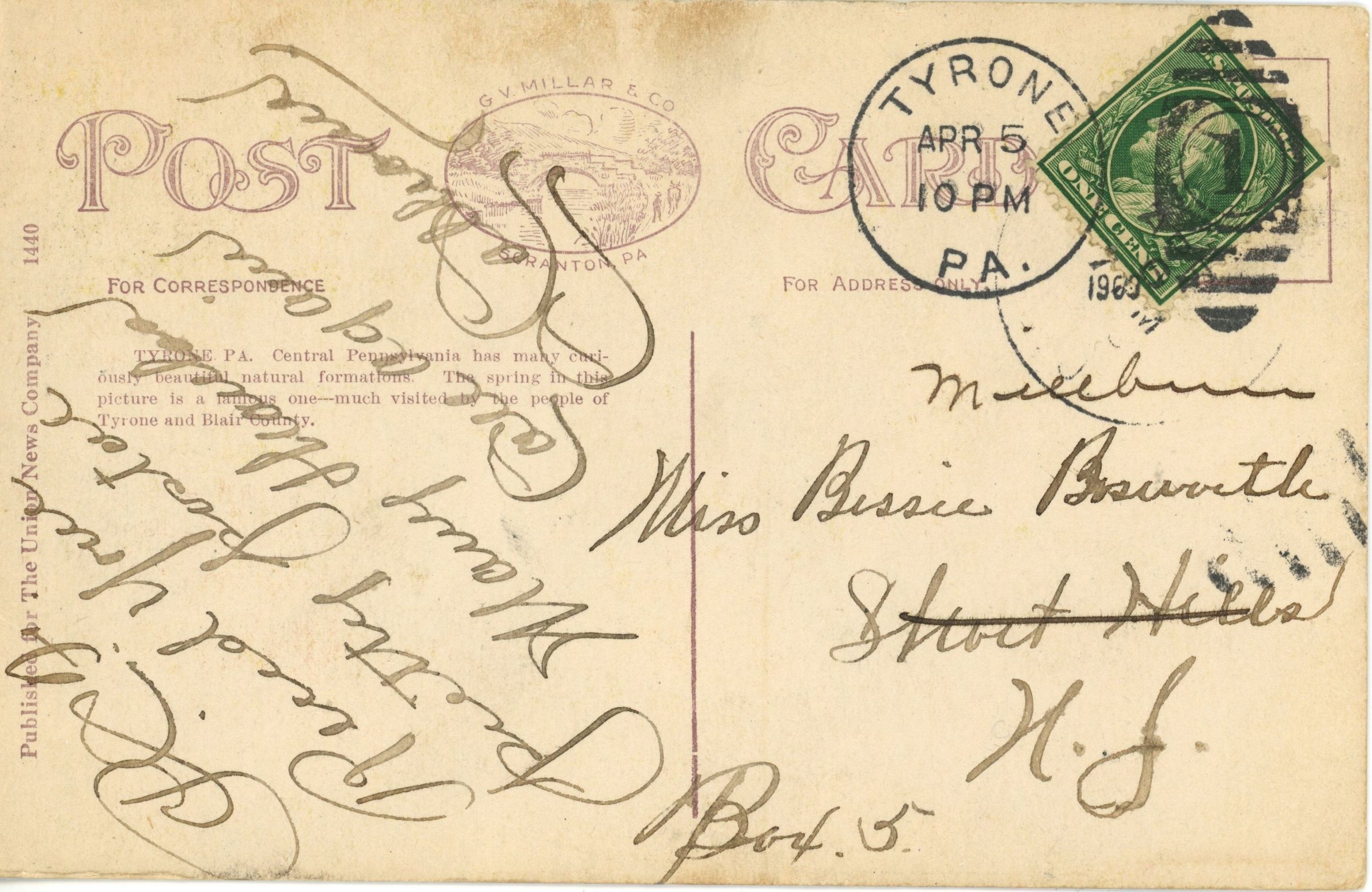 Postcard of "The Cave" in Sinking Valley near Tyrone, Pennsylvania sent to Bessie Bosworth, Box 5, Millburn, NJ from Tyrone , PA, April 5 (date is unclear) at 10 pm. The message reads: Received your pretty postal. Many thanks! Call again. C. Callio (?)Collection