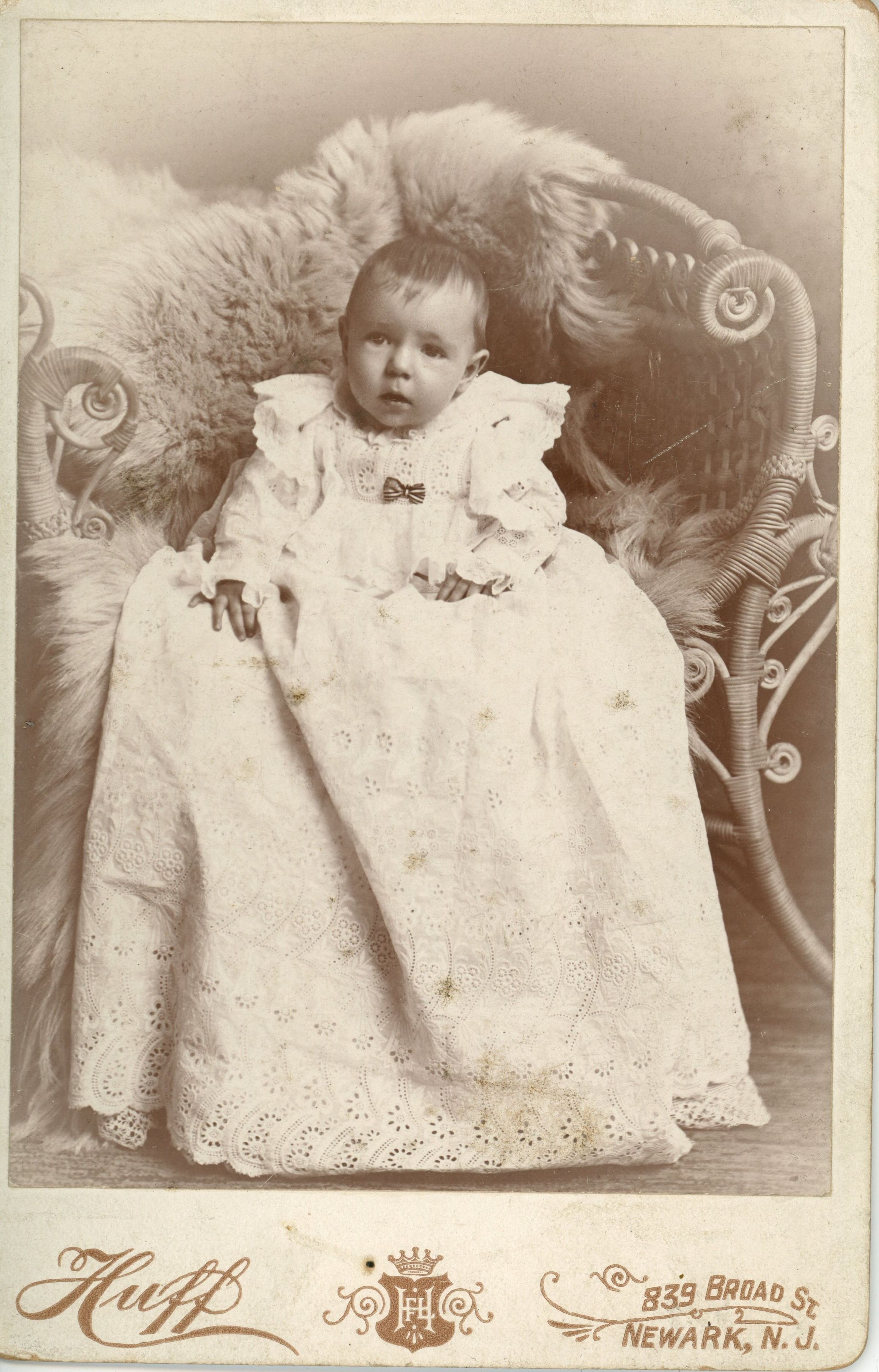 Photograph of unidentified baby seated in large wicker chair with fur rug taken at the Huff Studio, 839 Broad Street, Newwark. Inscription on verso of photograph say "Roy," suggesting that the sitter may be Roy Oliver.