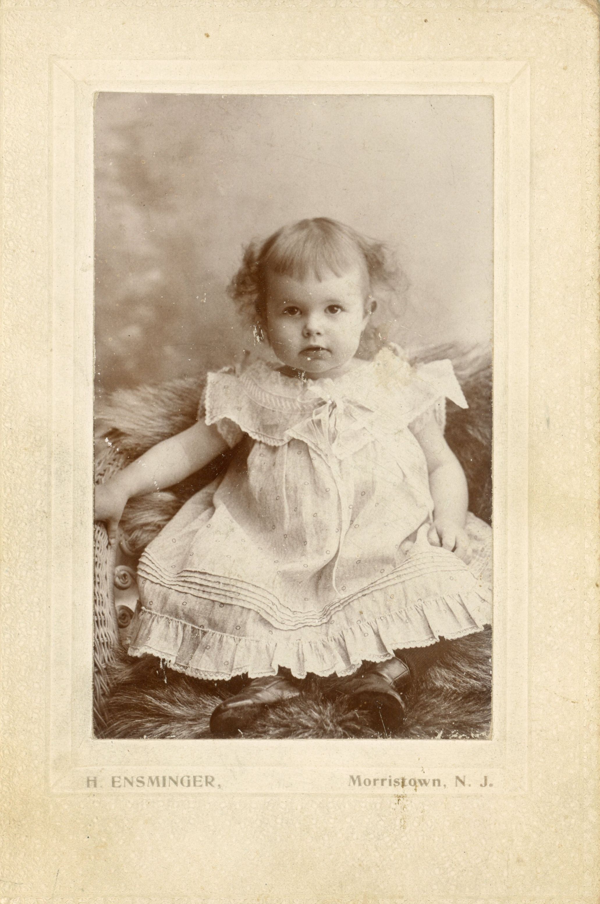 Photograph of an unidentified sitter little girl seated on a fur carpet taken at H. Ensminger studio, 17 Park Place, Morristown. H. Ensminger operated a photography studio at this address in Morristown from at least 1897-1900. The photograph comes from the Bosworth collection of photographs of unidentified sitters.Photograph Details