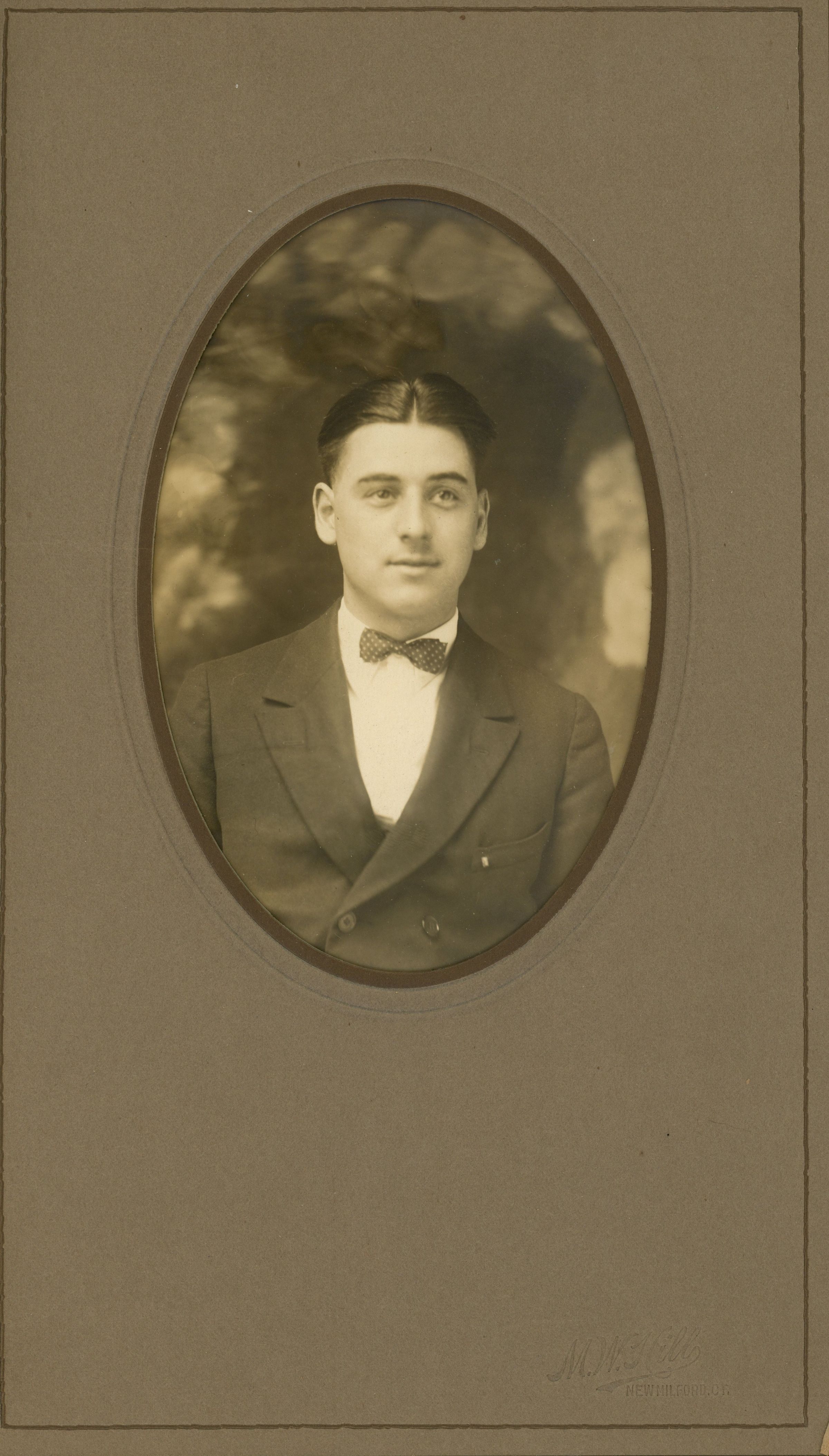 Photograph of an unidentified man taken at the M.W. Hill Studio, New Milford, CT from the Bosworth collection of photographs of unidentified sitters. Photographers stamp on matte and on protective envelope.Collection