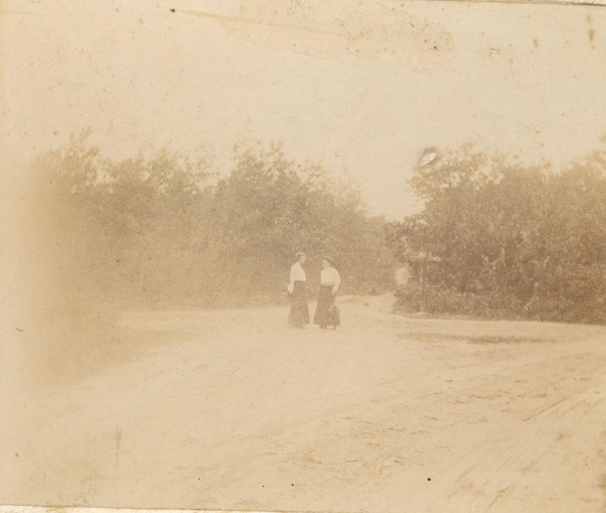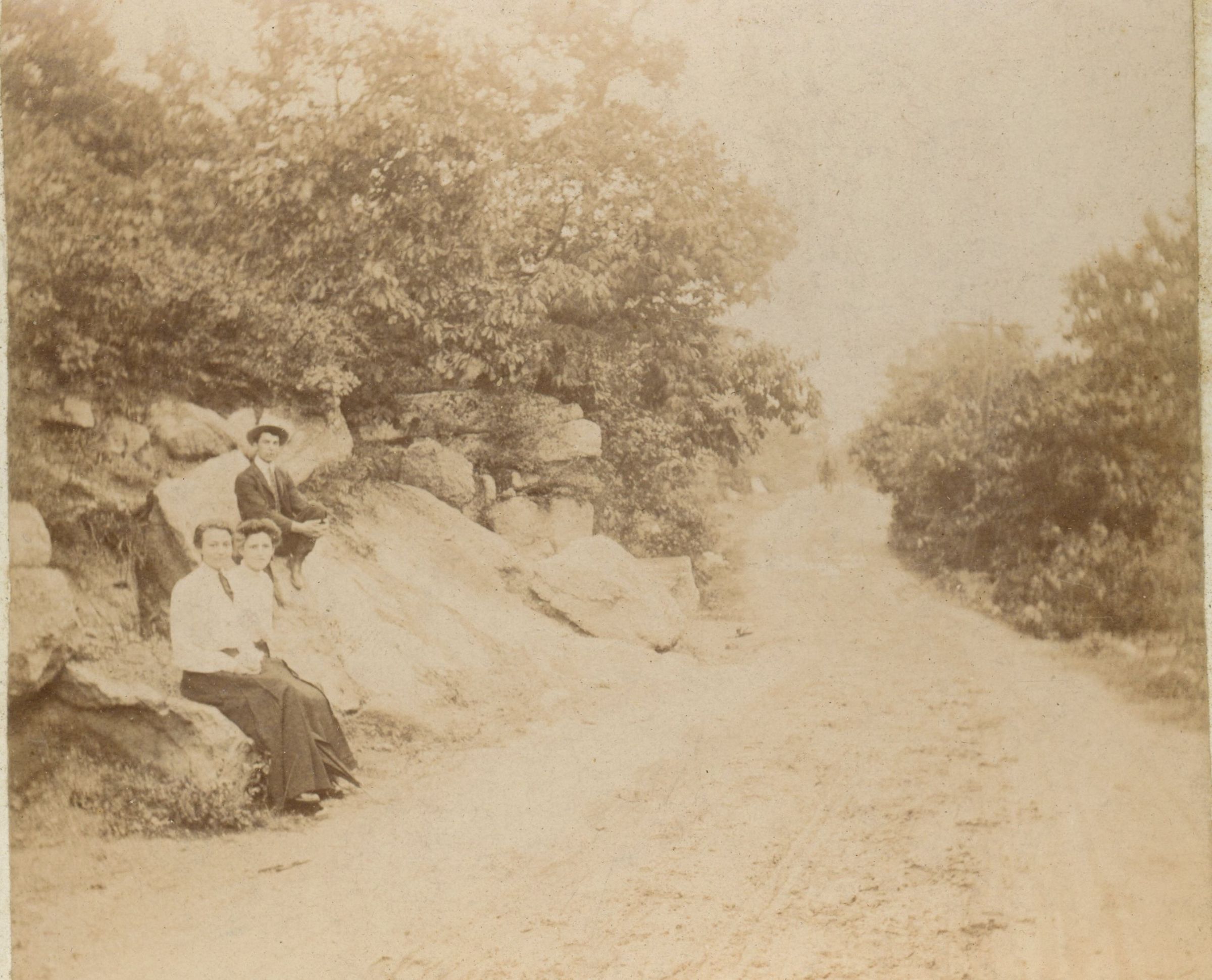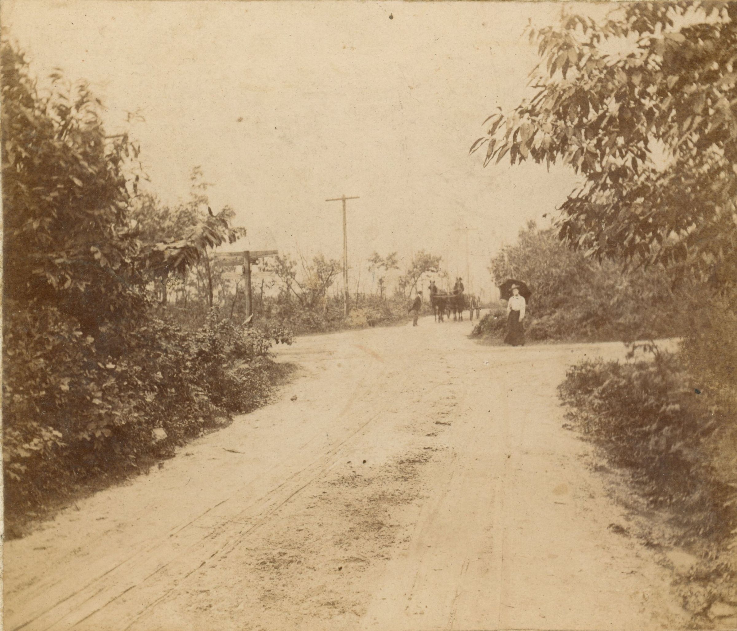 Photographs of unidentified well-dressed people standing on dirt roads or pathways. Possibly generic scenes.Collection