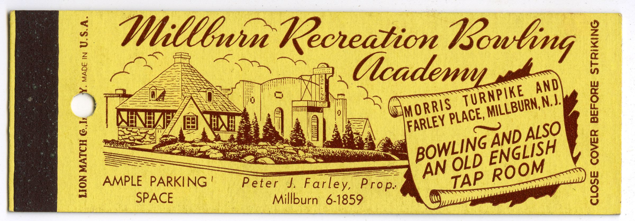 Millburn Recreation Bowling Academy operated from 1942-1951. In December 1951, Peter J. Farley rented out the building for another use and transferred the liquor license to the Millburn Inn. Peter J. Farley was a building contractor, who also owned the Morris and Essex Roller Rink in Springfield. Matchbook purchased on eBay from Lynne Ranieri. Cover is cardboard-open and tan in color with brown sketch of building and above in script, "Millburn Recreational Bowling Academy". On right side is scroll and written inside is, "MORRIS TURNPIKE AND FARLEY PLACE, MILLBURN, N.J. BOWLING AND ALSO AN OLD ENGLISH TAP ROOM. Along bottom says, "AMPLE PARKING SPACE Peter J. Farley, Prop. Millburn 6-1859.Acquisition