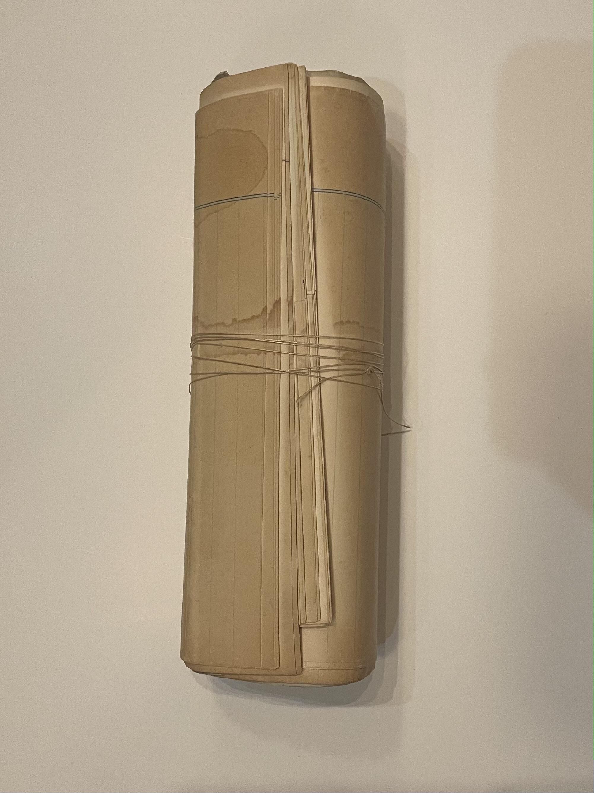 Notes folded and rolled up, bound by thread