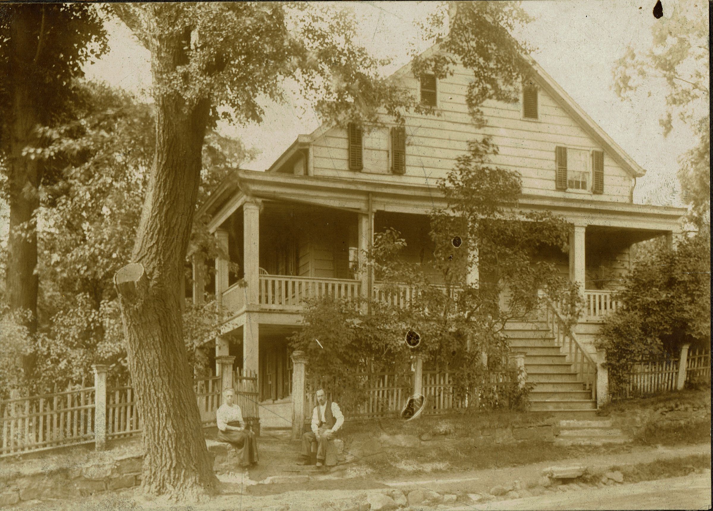 One of several prints of this photographs of the Brison House on Old Short Hills Road and Brookside Drive showing Edwin Marsh Brison and Julia Marsh seated out front. Inscription on the verso of this print reads: