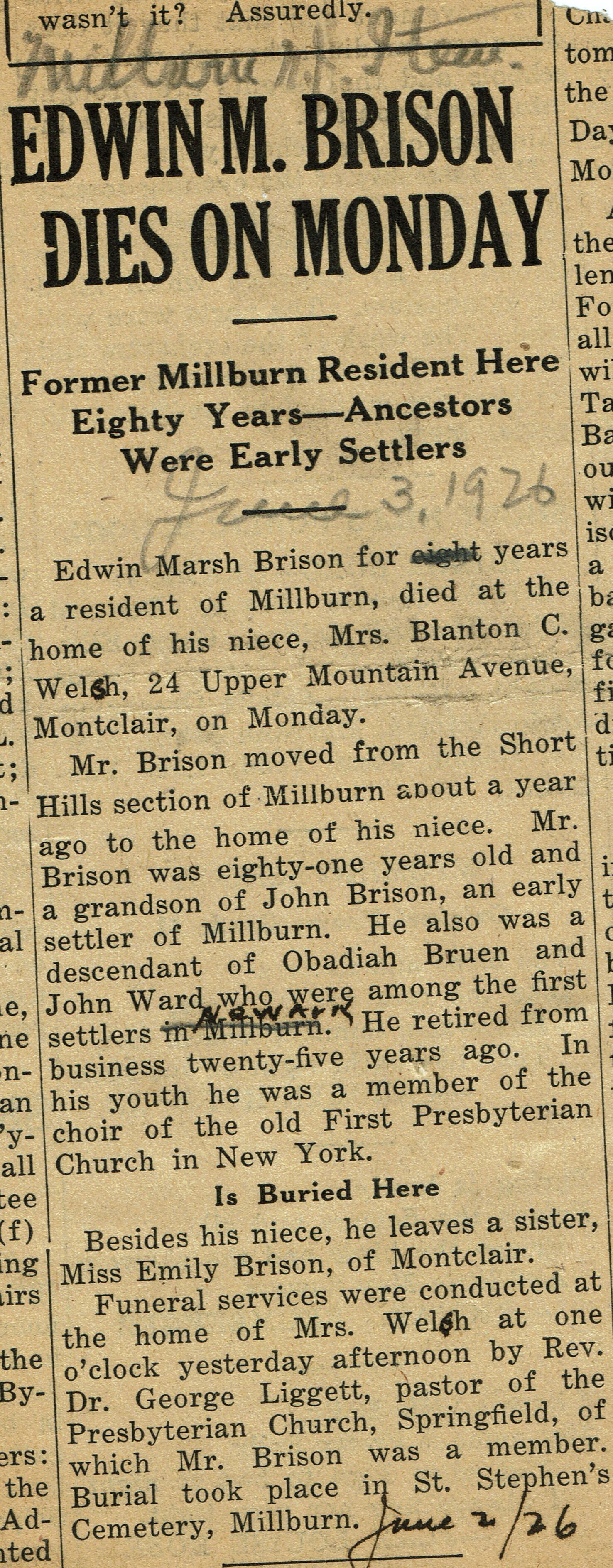 Obituary of Edward Marsh Brison in the Item of Millburn-Short Hills, June 3, 1926. We have multiple clippings of the Item announcement.Collection