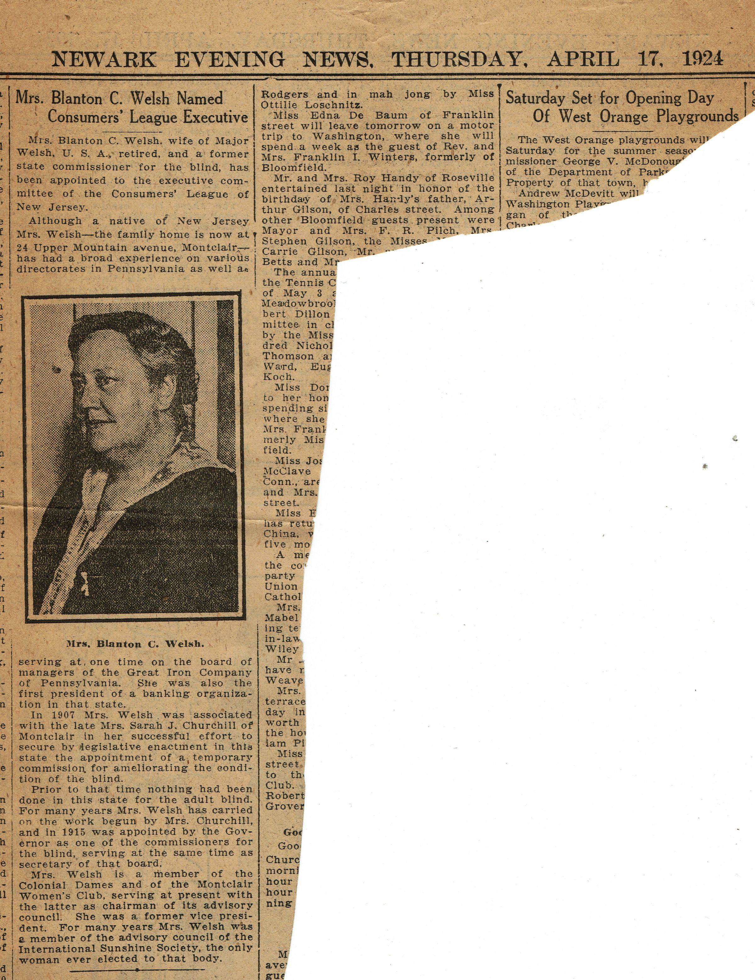 Article from the Newark Evening News (April 17, 1924), about the appointment of Emilie Welsh (Mrs. Blanton C. Welsh) to the Executive Committee of the Consumers' League of New Jersey. Emily Benson Welsh was the daughter of Benjamin Benson, and granddaughter of David Brison.Collection