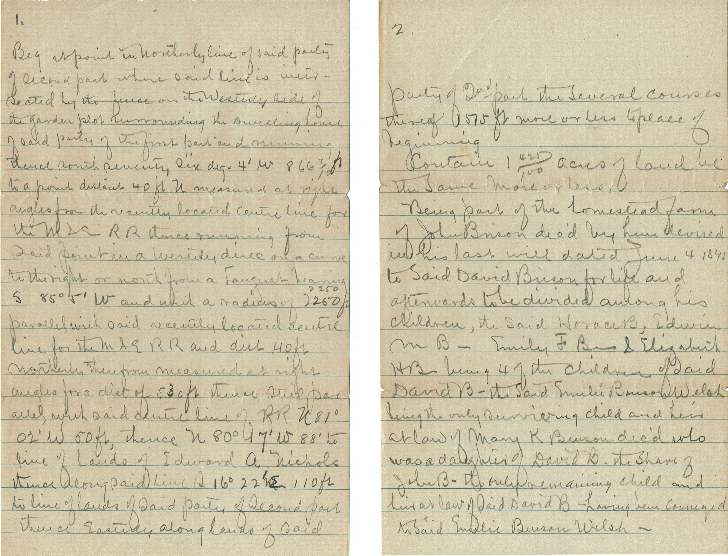 Two pages of notes relating to the Brison Estate and how it was to be divided upon David Brison's death. Contains a hand-drawn map. Probably notes for a will.Collection