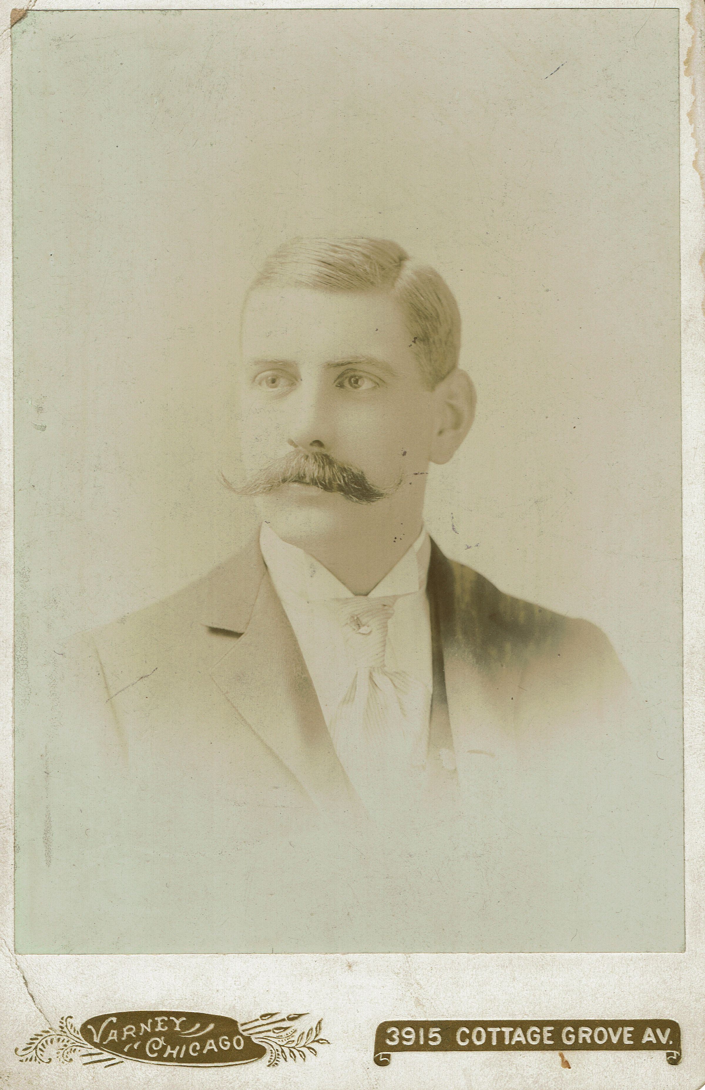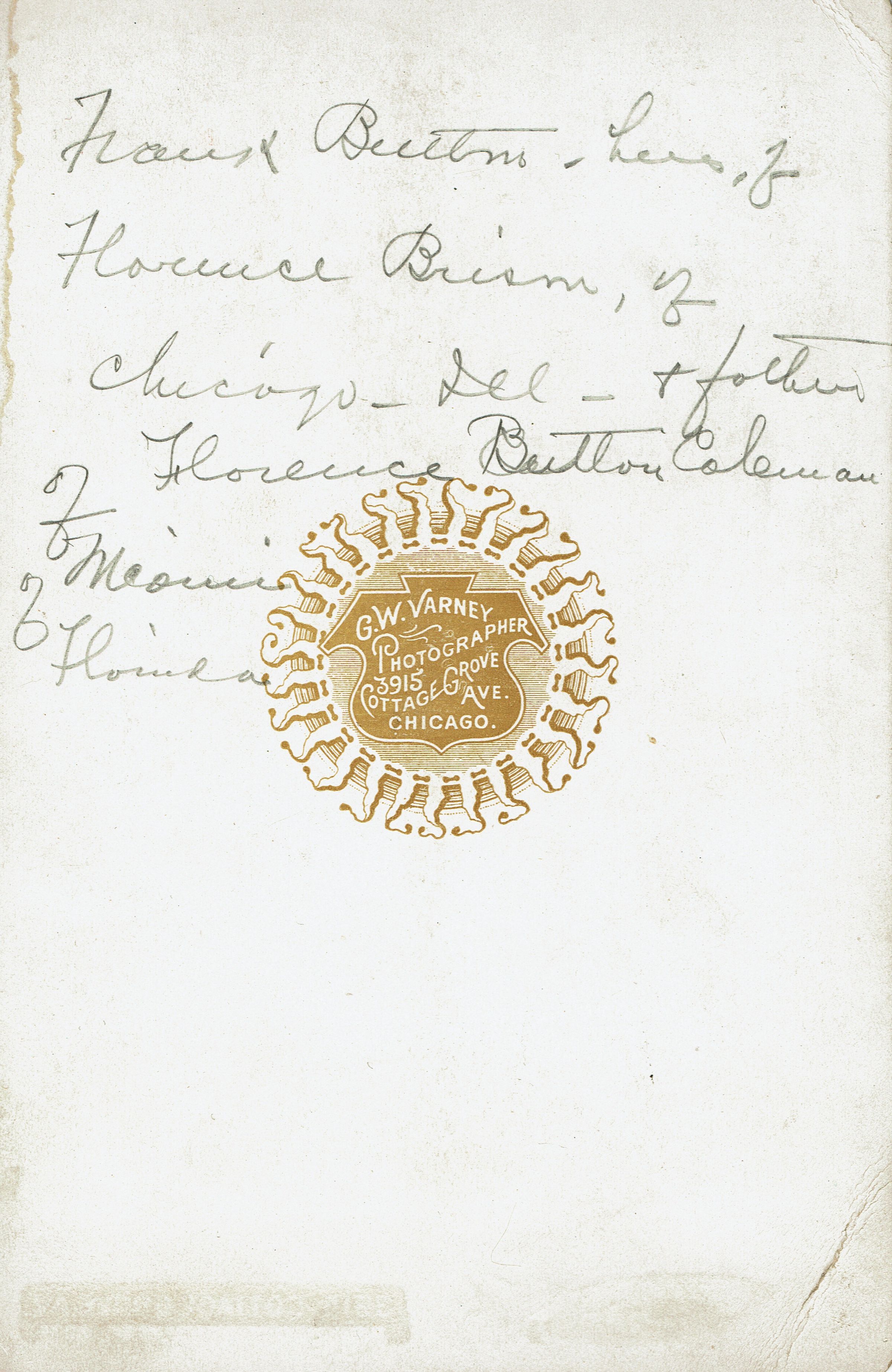 Photograph of Frank Button. Text on reads: Frank Button, husband of Florence Brison of Chicago, Ill. and father of Florence Button Coleman of Miami, Florida. The photograph was taken by G. W. Varney Photographer, 3915 Cottage Grove Avenue, Chicago.Photograph Details
