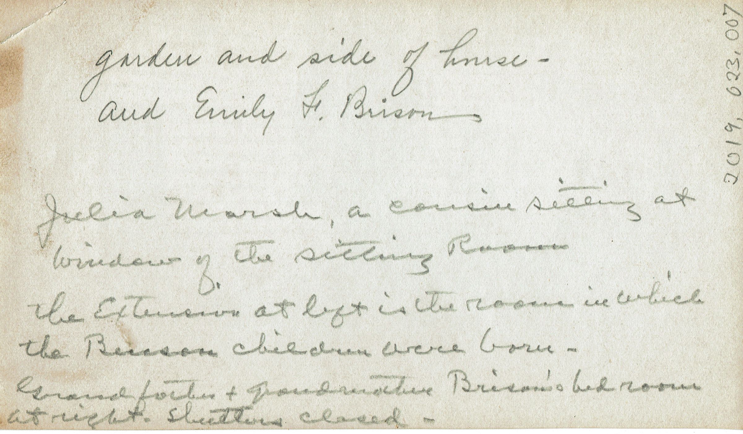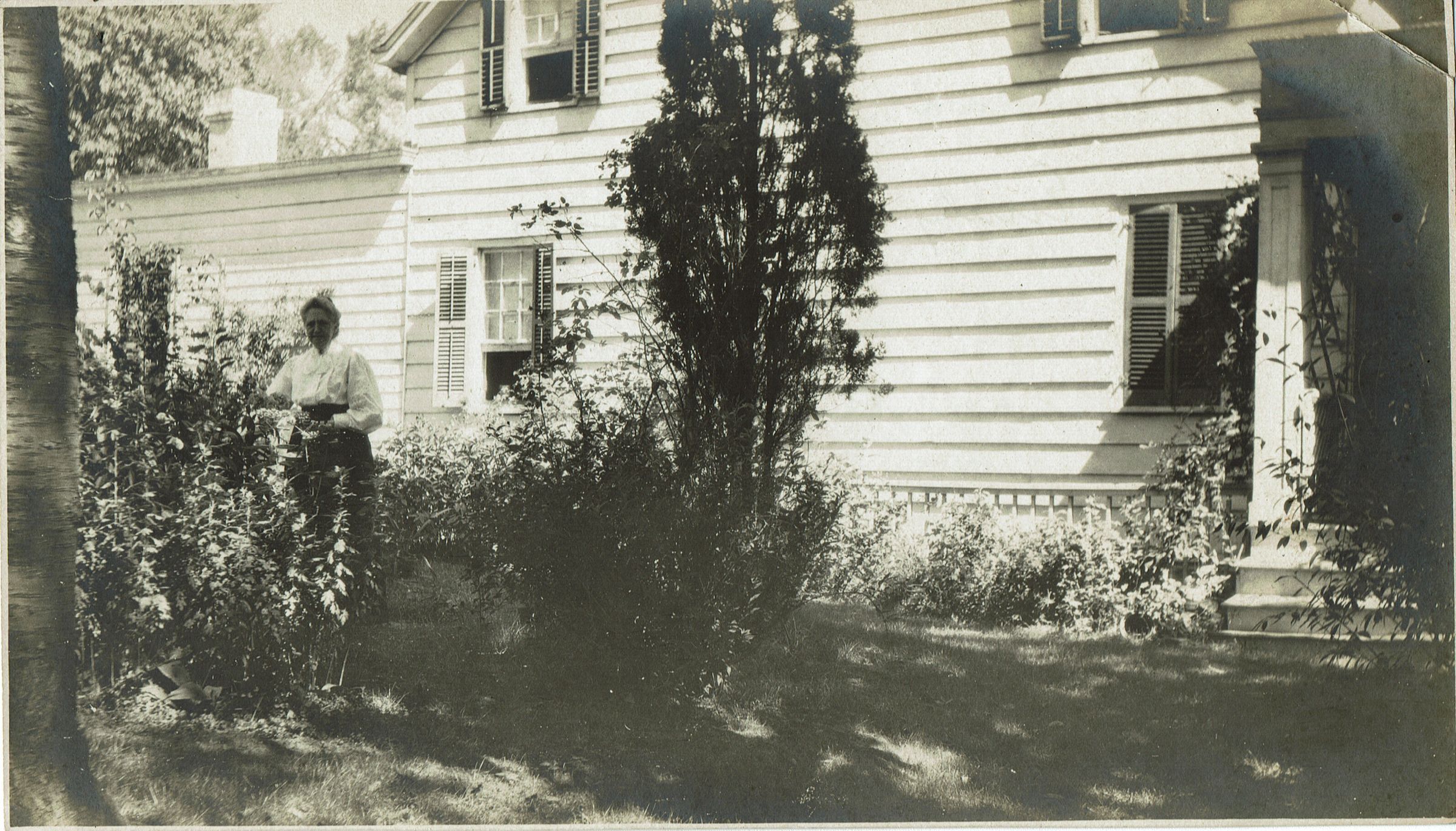 Inscription on back of photograph reads: Garden and Side of house and Emily F. Brison. Julia Marsh, a cousin, sitting at the window of the sitting room. The extension at left is the rooms in which the Benson children were born--Grandfather and Grandmother Brison's bedroom at right (shutters closed).Collection