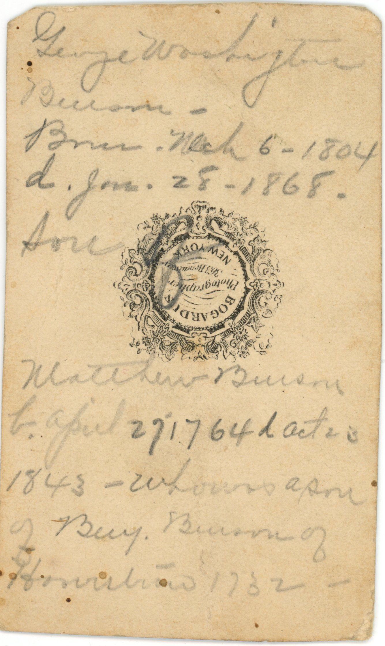 Photograph of George Washington Benson from the Brison family photo album. G.W.Benson (March 6, 1804-January 28, 1865) was the son of Matthew Benson (April 17, 1864-October 28, 1843), who was a son of Benjamin Benson.