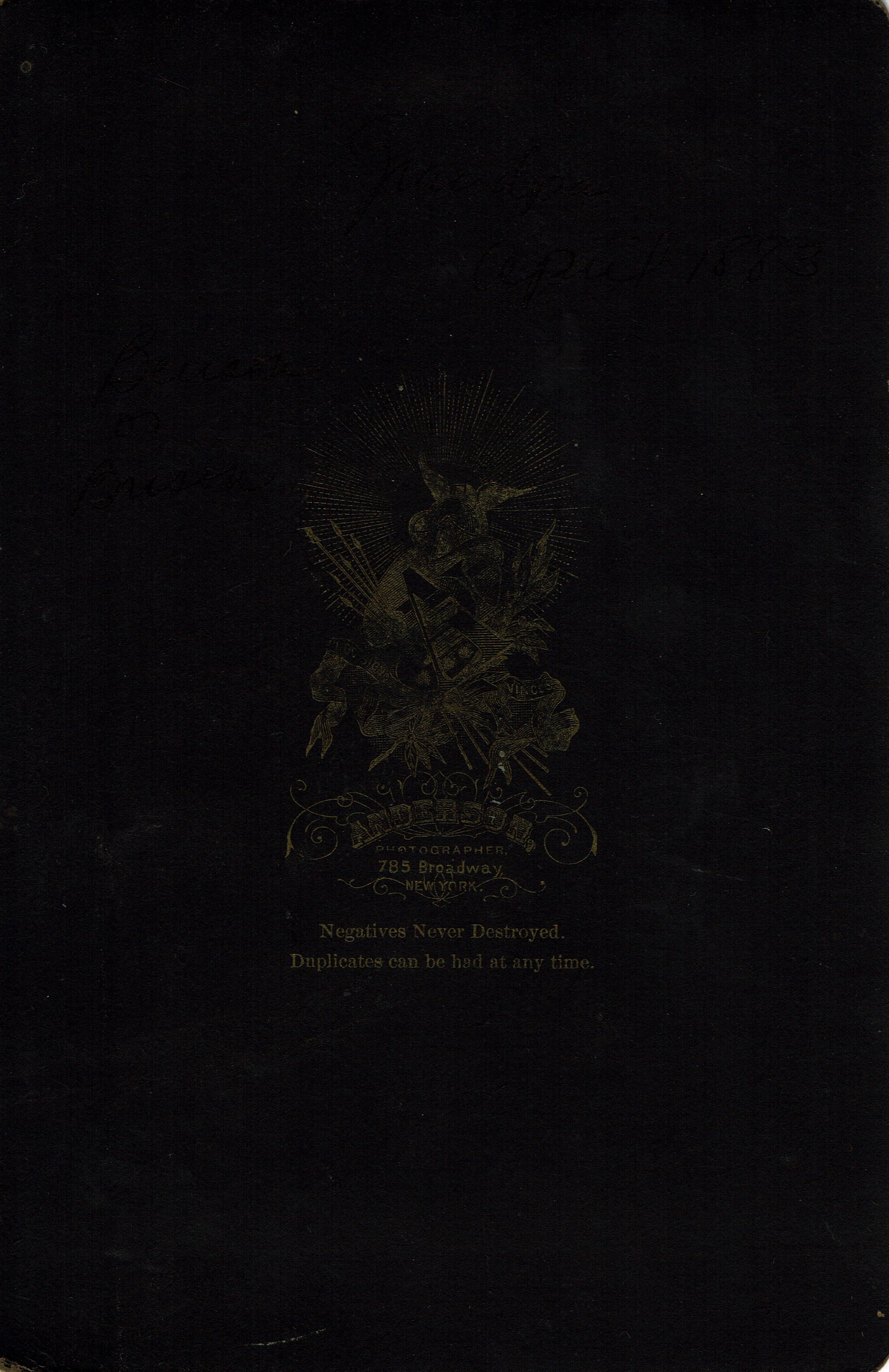 Photograph identified as either Grandpa Brison or Benson dated April 1883. Taken at Anderson Photography Studio, 785 Broadway, New York, New York.Photograph Details