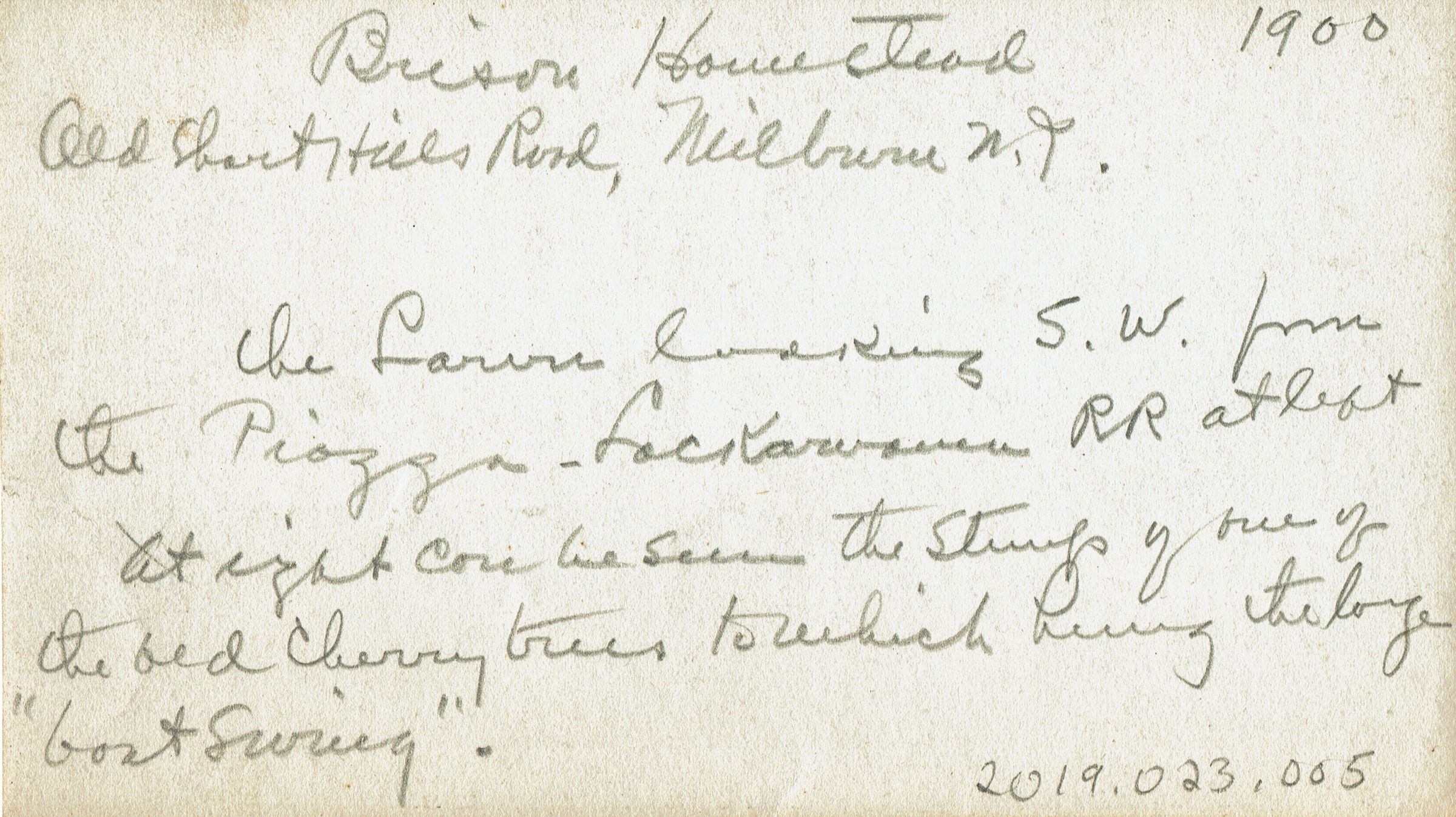 Inscription on back of photograph reads: Brison Homestead, Old Short Hills Road, Millburn, NJ, 1900. The Lawn looking S.W. from the Piazza. Lackawanna Railroad at left. At right can be seen the stump of one of the old cherry trees to which hung the large " Boat Swing."Collection
