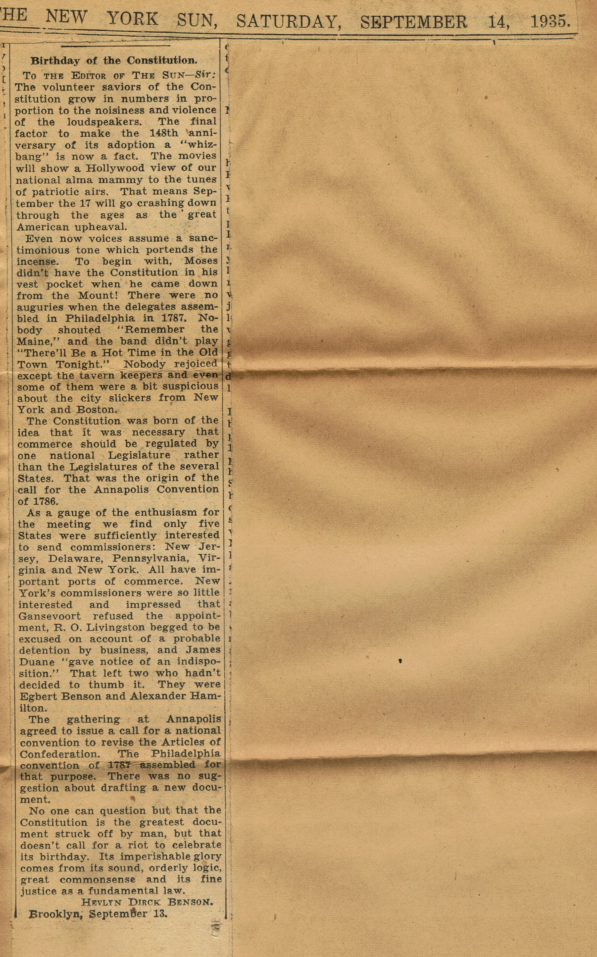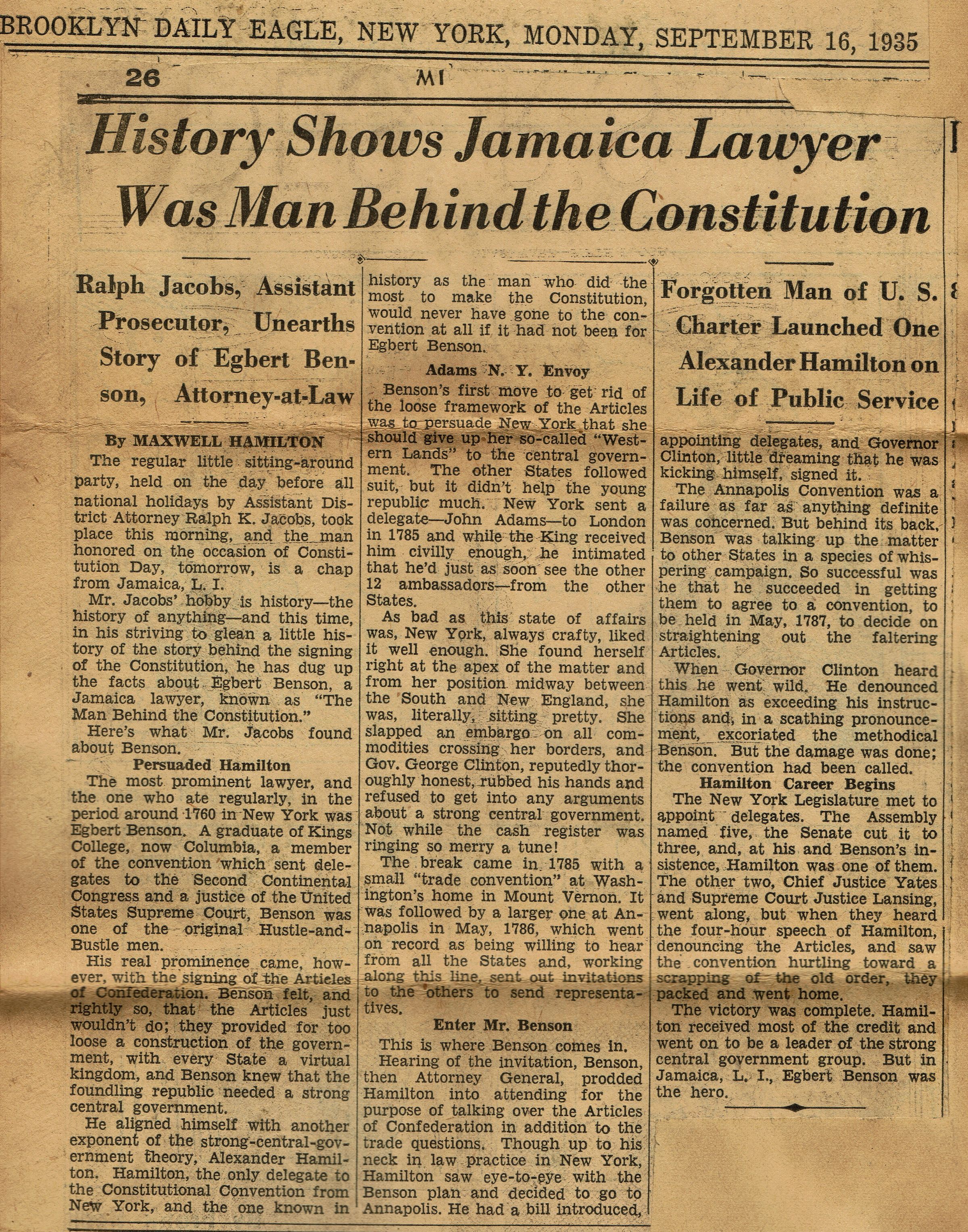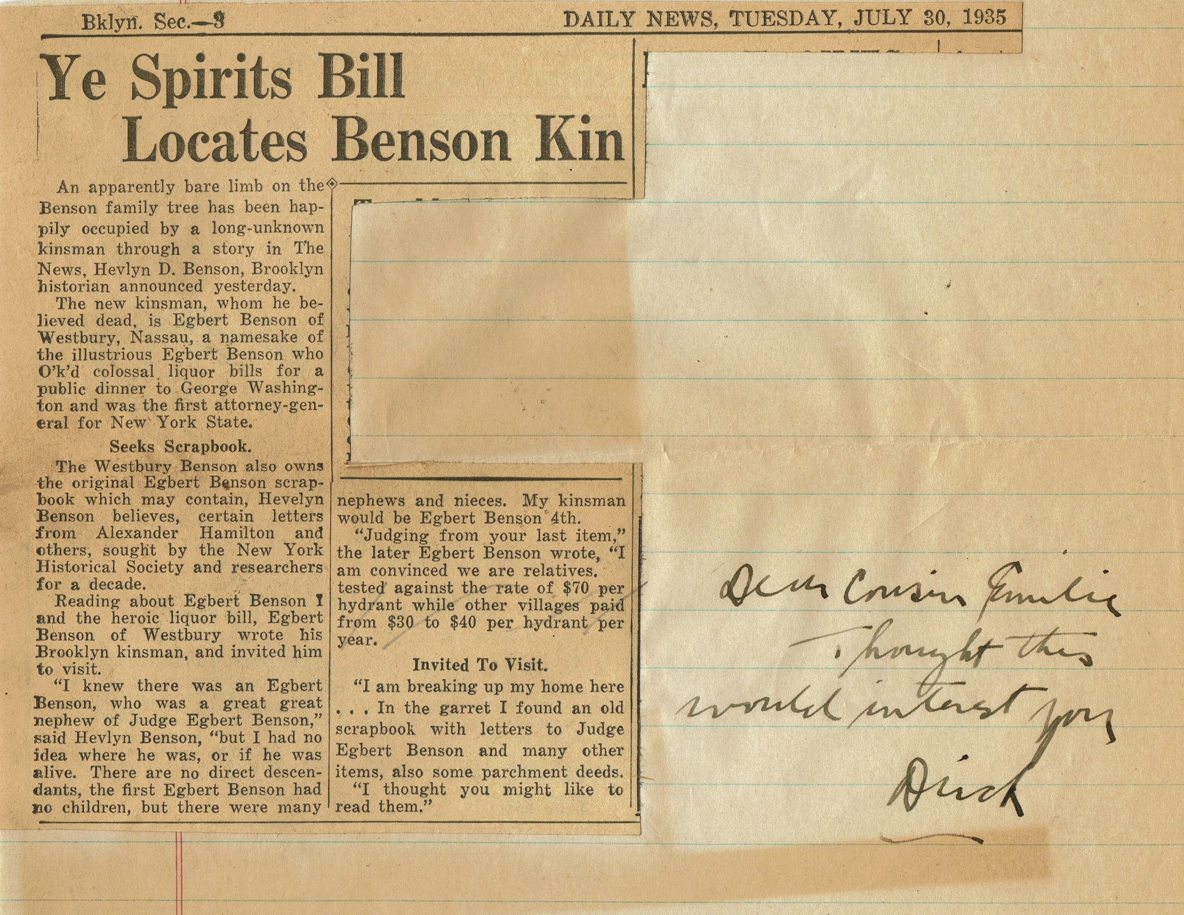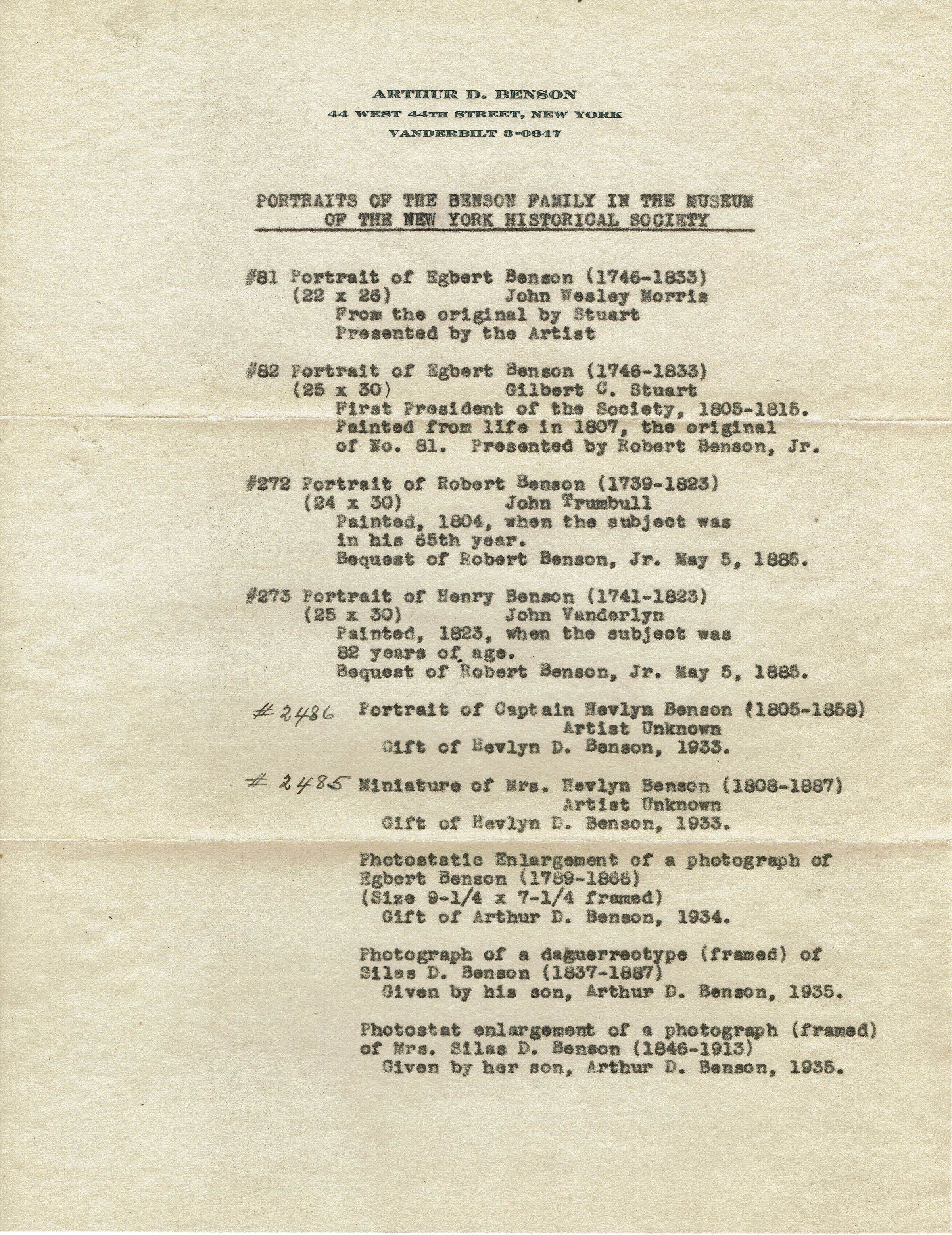 11 letters which include information and newspaper clippings about Arthur Benson's lineage from Dirck Benson, a Includes a historic marker about the Benson Mill on the Harlem River, Egbert Benson's role in initiating the Constitutional Convention, service of Abraham Benson in War of 1812, and information about Benson portraits at New York Historical Society: