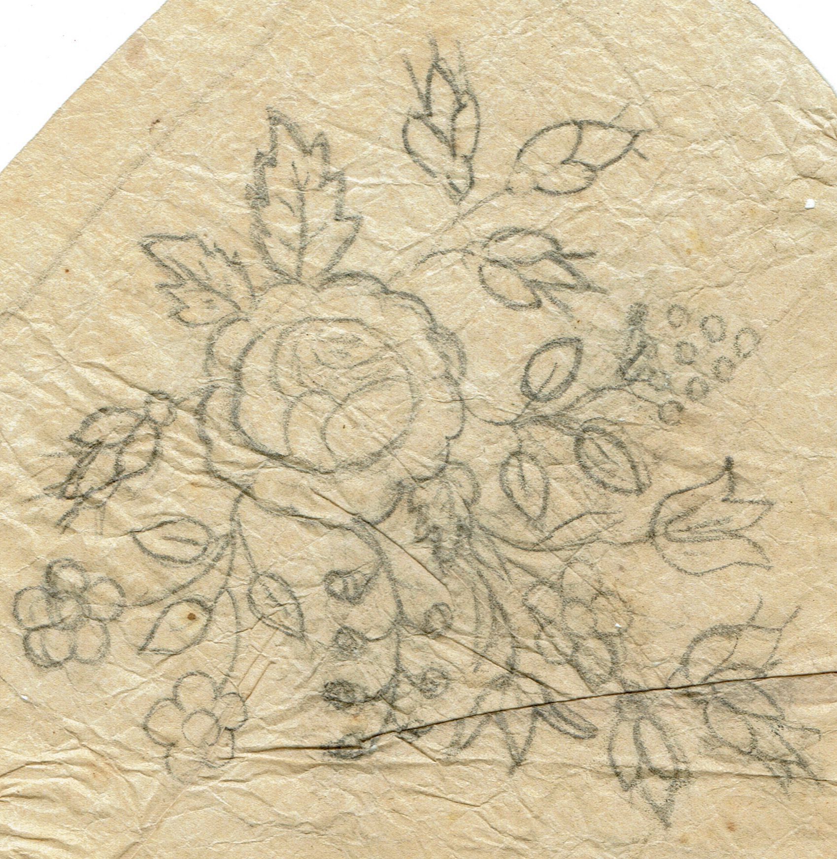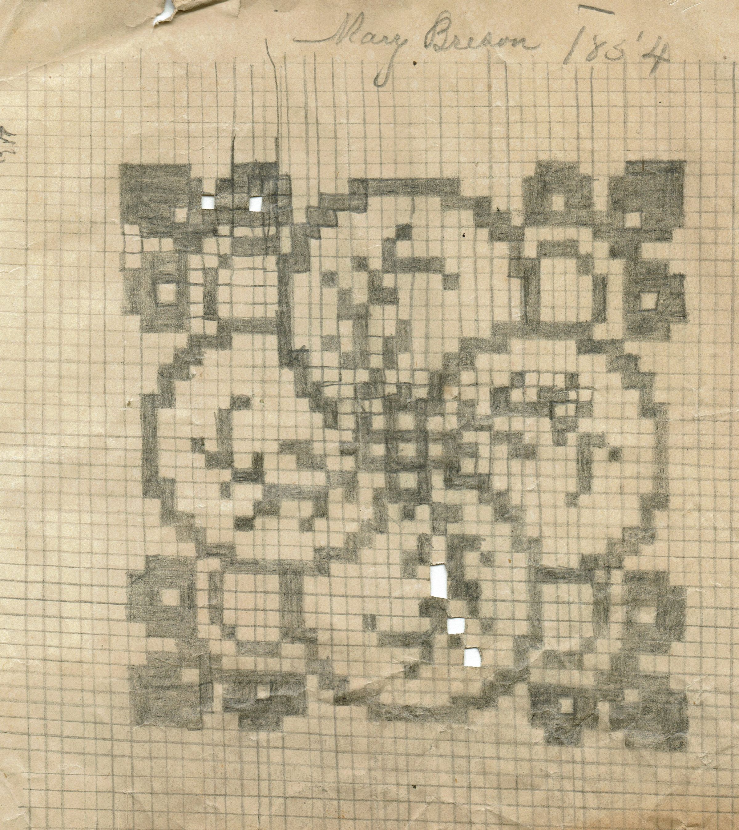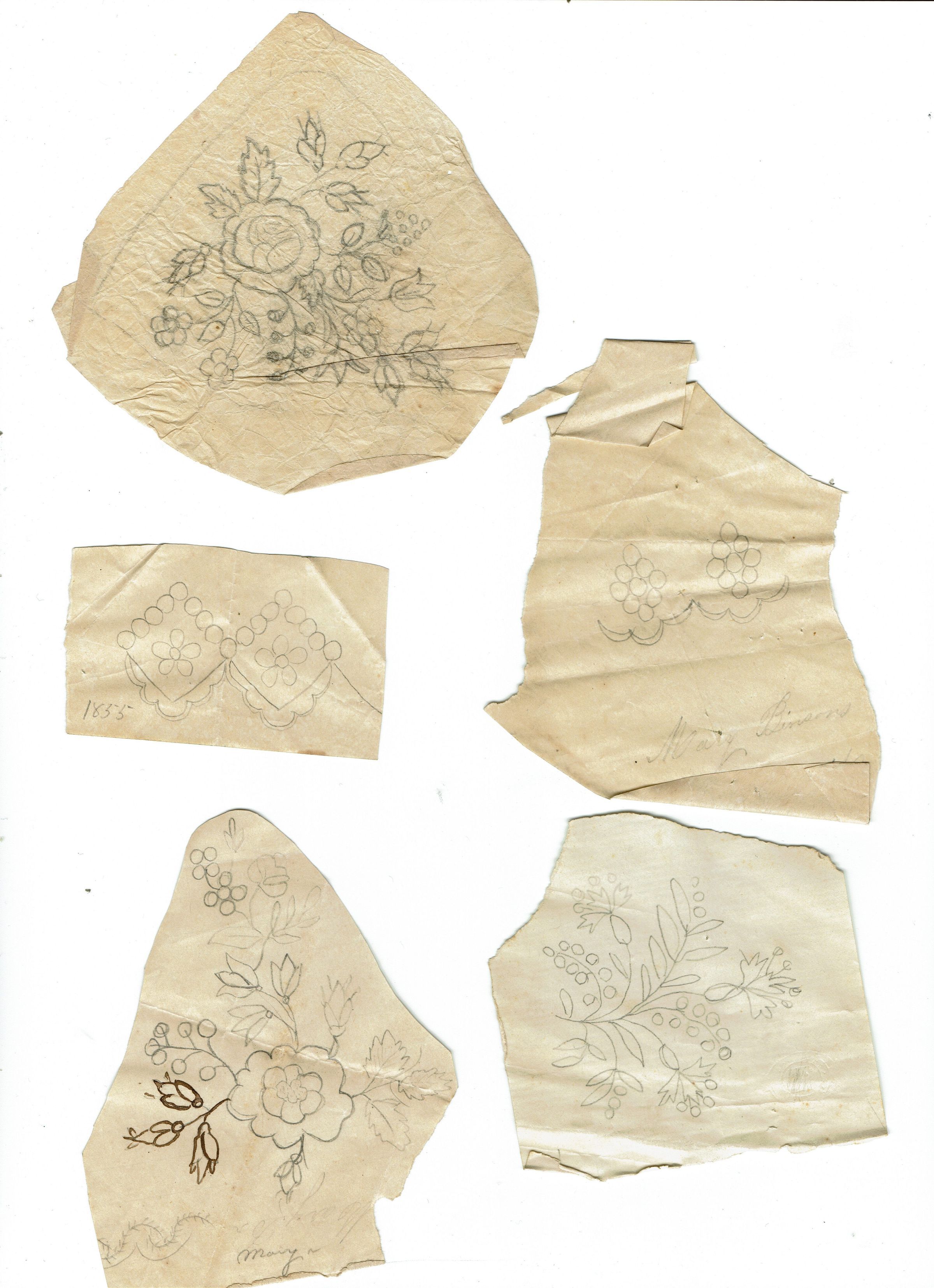 5 scraps of paper with designs for embroidery and one gridded floral design made by Mary Brison in the mid 1850s.