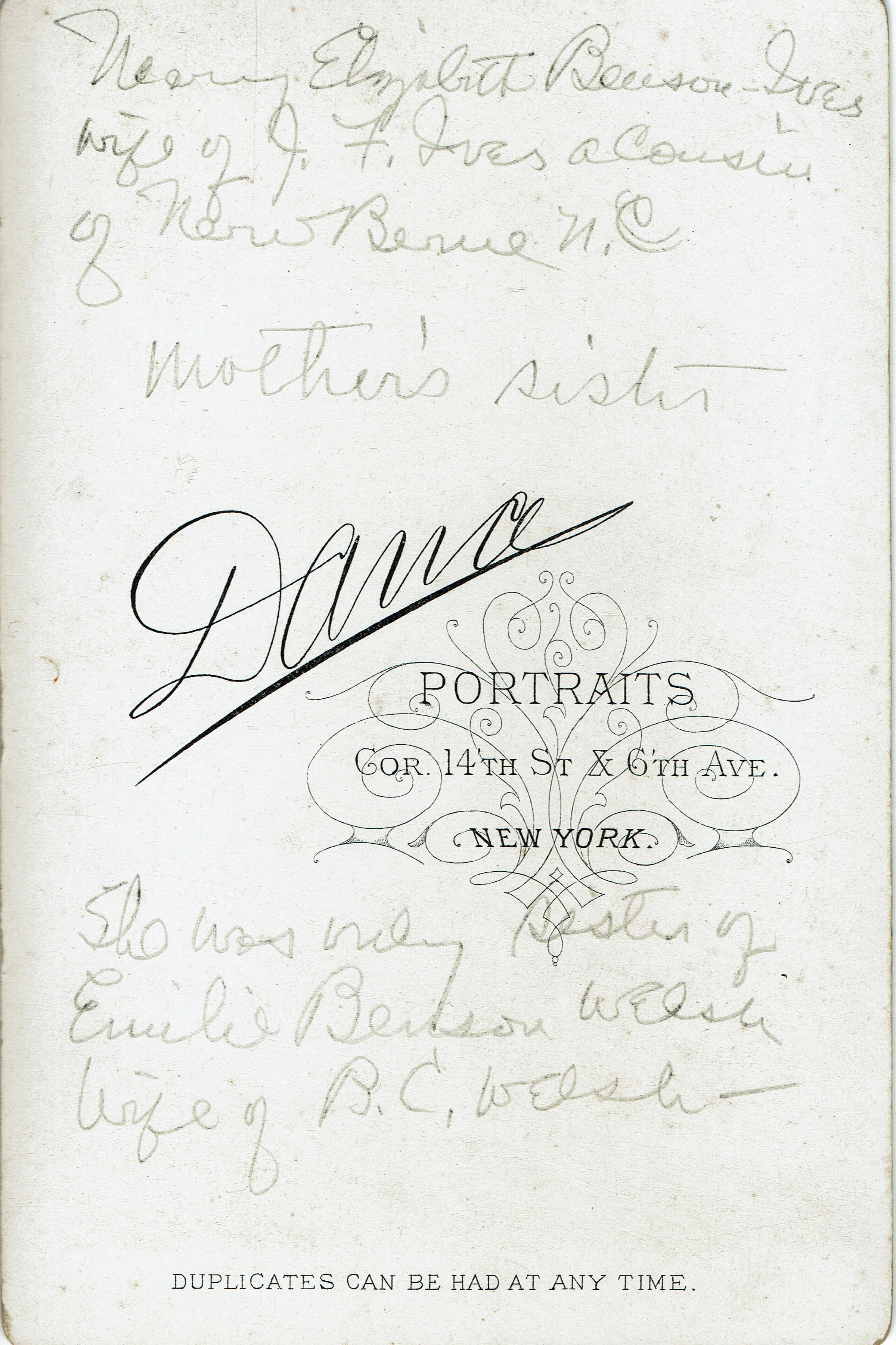 Photograph of Mary Elizabeth Benson Ives, sister of Emilie Benson Welsh and wife of James F. Ives of New Berne, North Carolina. Photograph is undated, but after 1879. See: 2021.276.070.