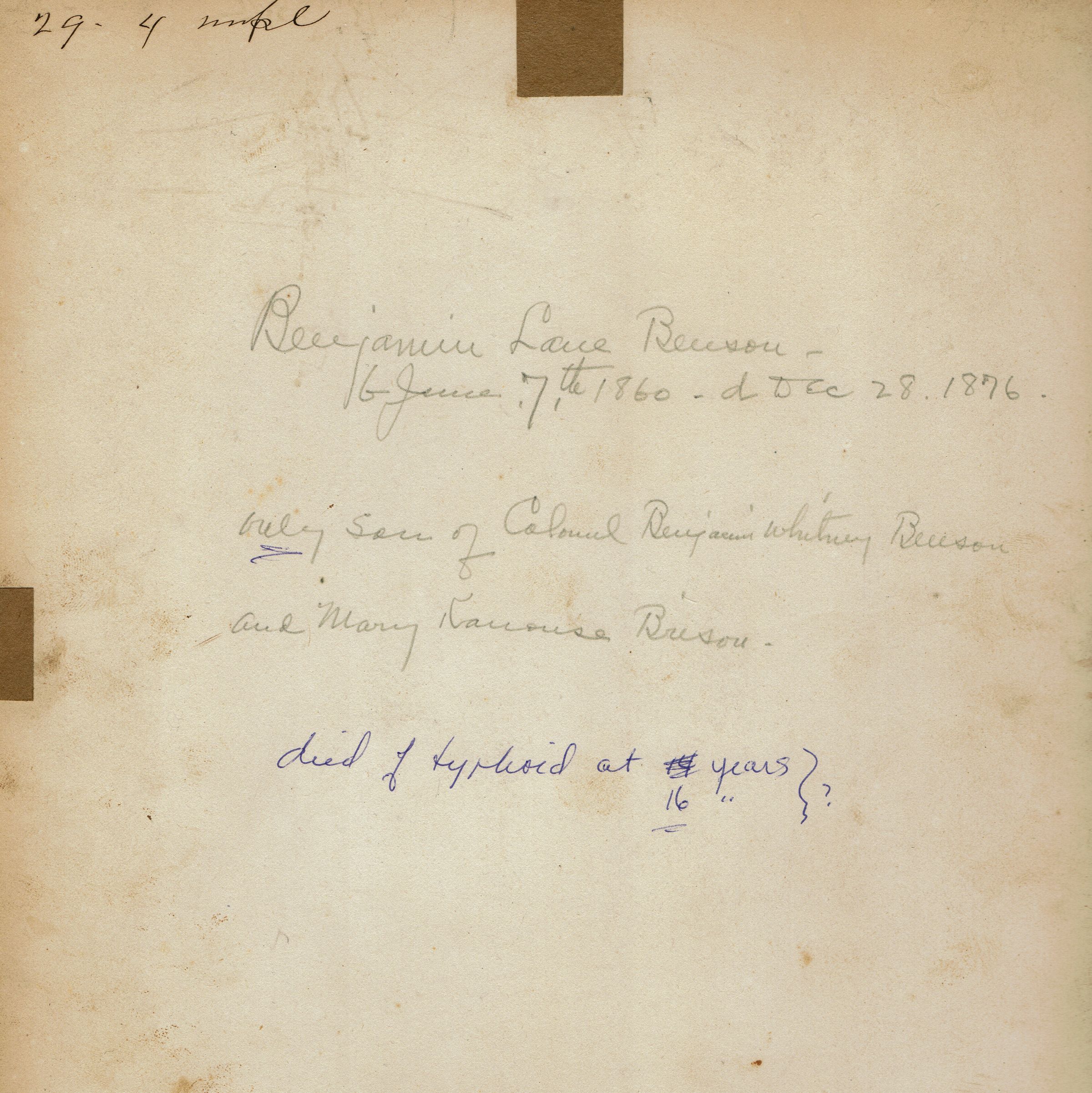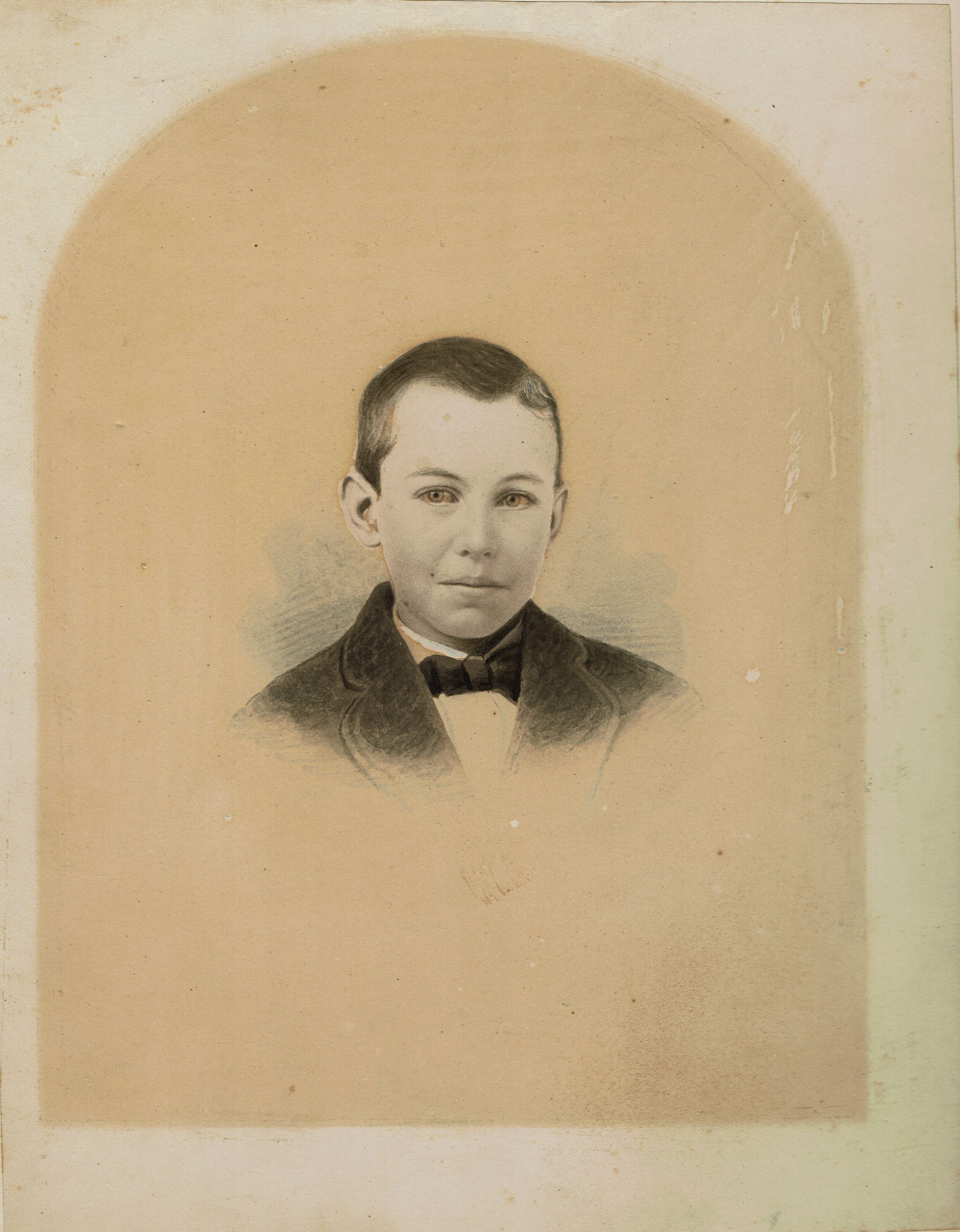 Sketch (Pencil with wash) probably made from a photograph of Benjamin Lane Benson (June 7, 1860-December 28, 1876). Benjamin Lane Benson was the only son of Colonel Benjamin Whitney Benson and Mary Kanouse Brison, and brother of Emile Benson Welsh. Inscription on back of drawing states that he died of typhoid at 16 years. Note: Family bible states he died of typhoid fever on December 28, 1873, age 13 years, 6 months, 21 days.Collection