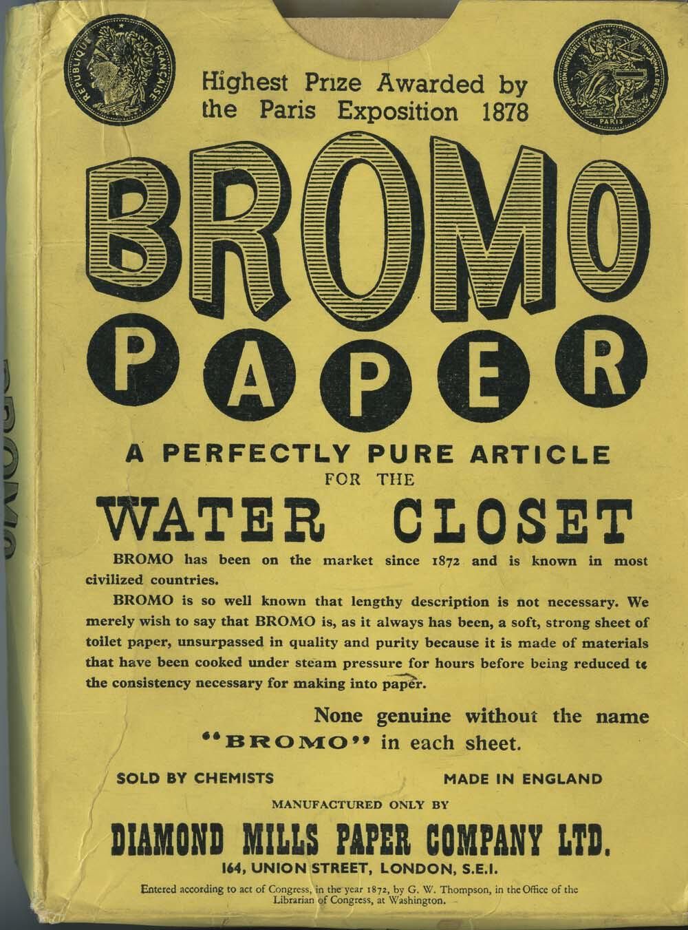 This is a box of *sheets* of toilet paper made in England by the Diamond Mills Paper Company of London. From a seller's online description of an identical box of Bromo paper sheets: "The paper contained the “disinfectants and curatives” Bromo chloralum and carbolic acid, which the manufacturers’ claimed would “…render its use not only a positive preventive of that most distressing and almost universal complaint, the Piles, but also a thorough deodorizer and disinfectant of the water closet”. However common hemorrhoids were at the time, the flush toilet was certainly not standard in 1878 and the smells that would have developed in the non-flush version, particularly over a hot summer, would have needed all the help with deodorization that could be given.