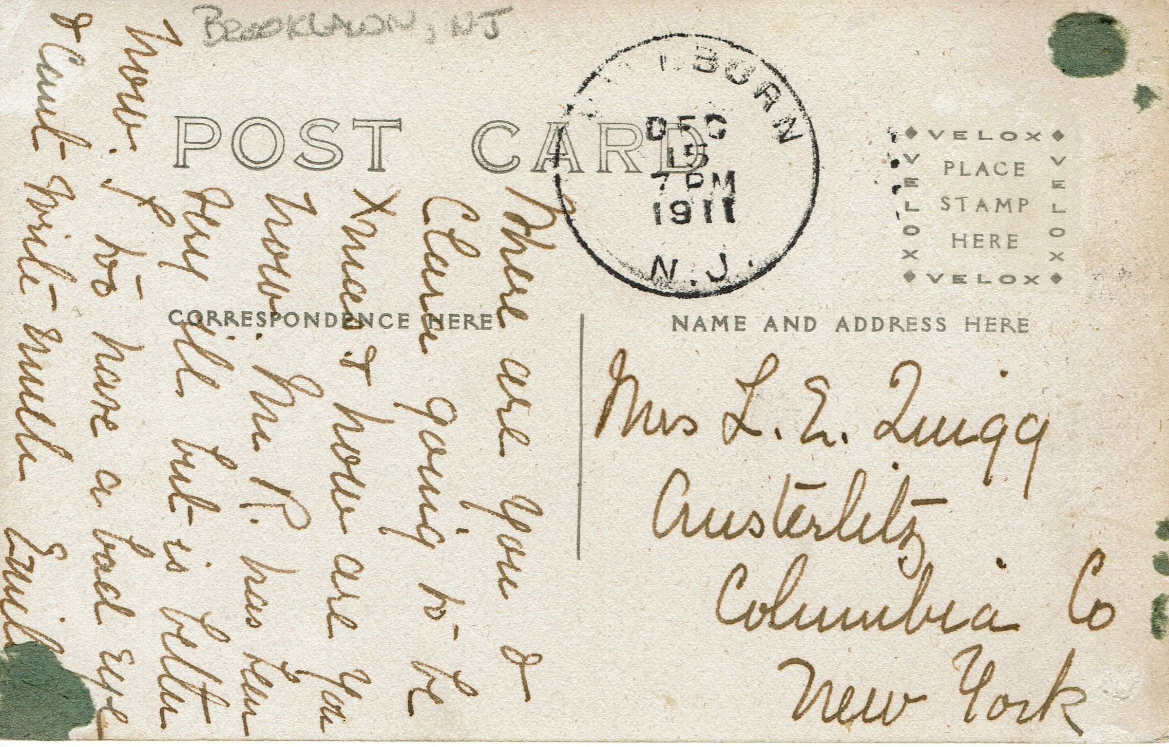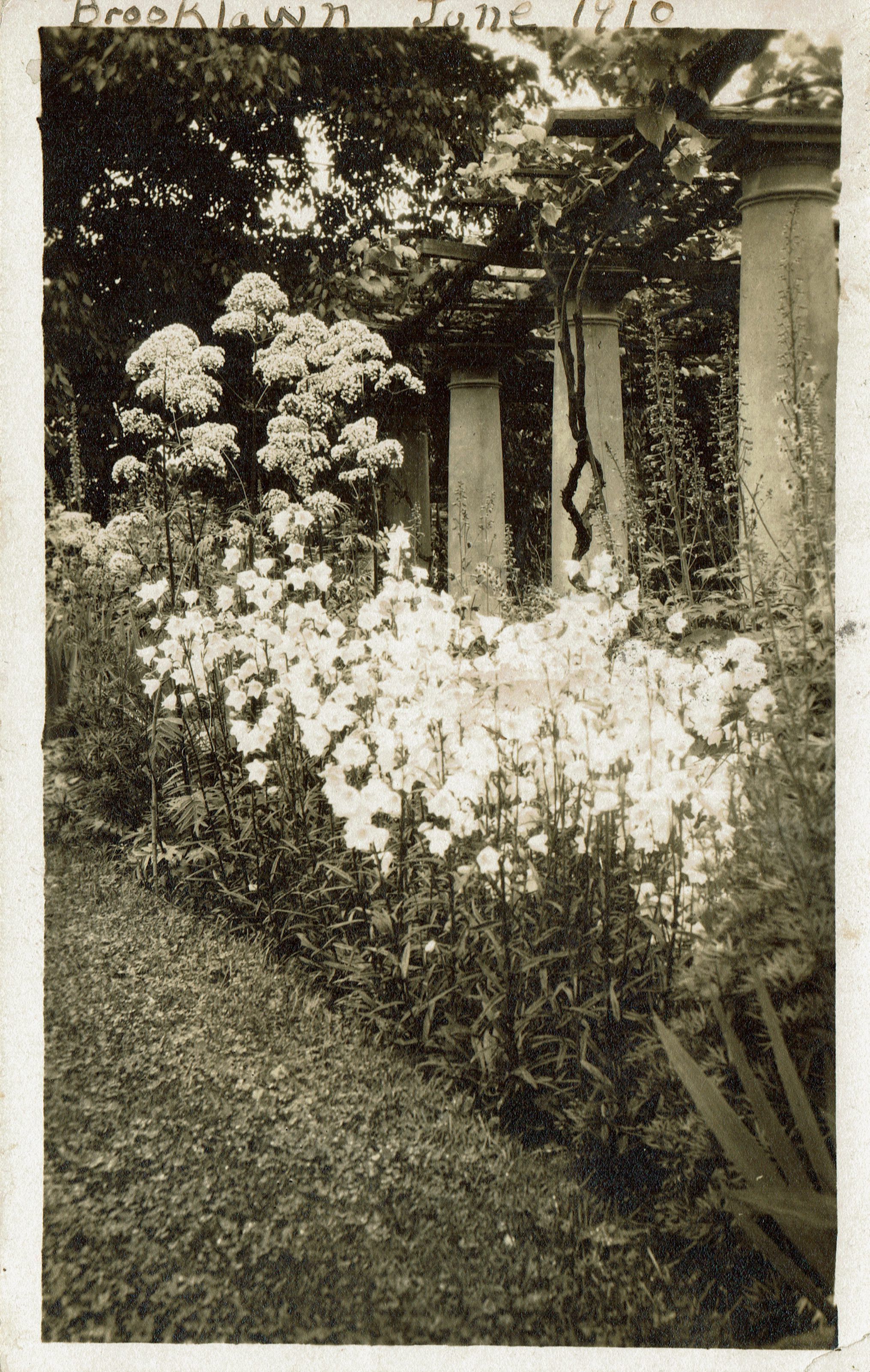 Postally used photographic postcard labeled Brooklawn, June 1910. Postmarked Millburn, December 15, 1911 and addressed to Mrs. L.E. Quigg Austerlitz, Columbia Country, New York. Postcard is signed Emily and refers to Mr. R. (Possibly Emily Renwick--given the garden reference).Collection