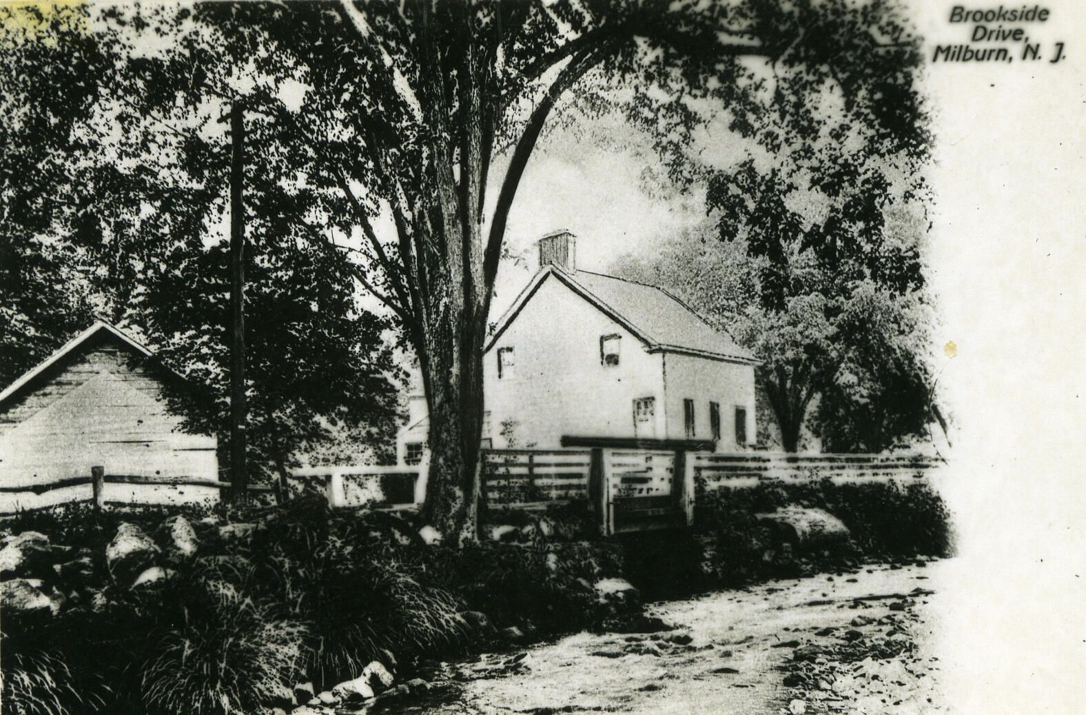 Photograph used in the Centennial Collection of postcard showing the House and Barn north of Diamond Mill Pond. This house and barn stood where the Elmdale Picnic area is today in the South Mountain Reservation. The outlet for the brook is still in existence at the curve above Diamond Mill Pond.Collection