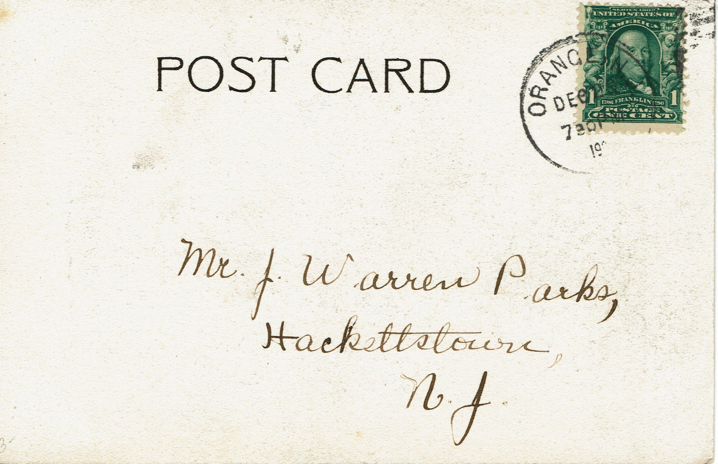 Postally used, postmarked December 23, 19??, 7:30 pm and addressed to Mr. J. Warren Parks, Hackettstown, NJ.Collection
