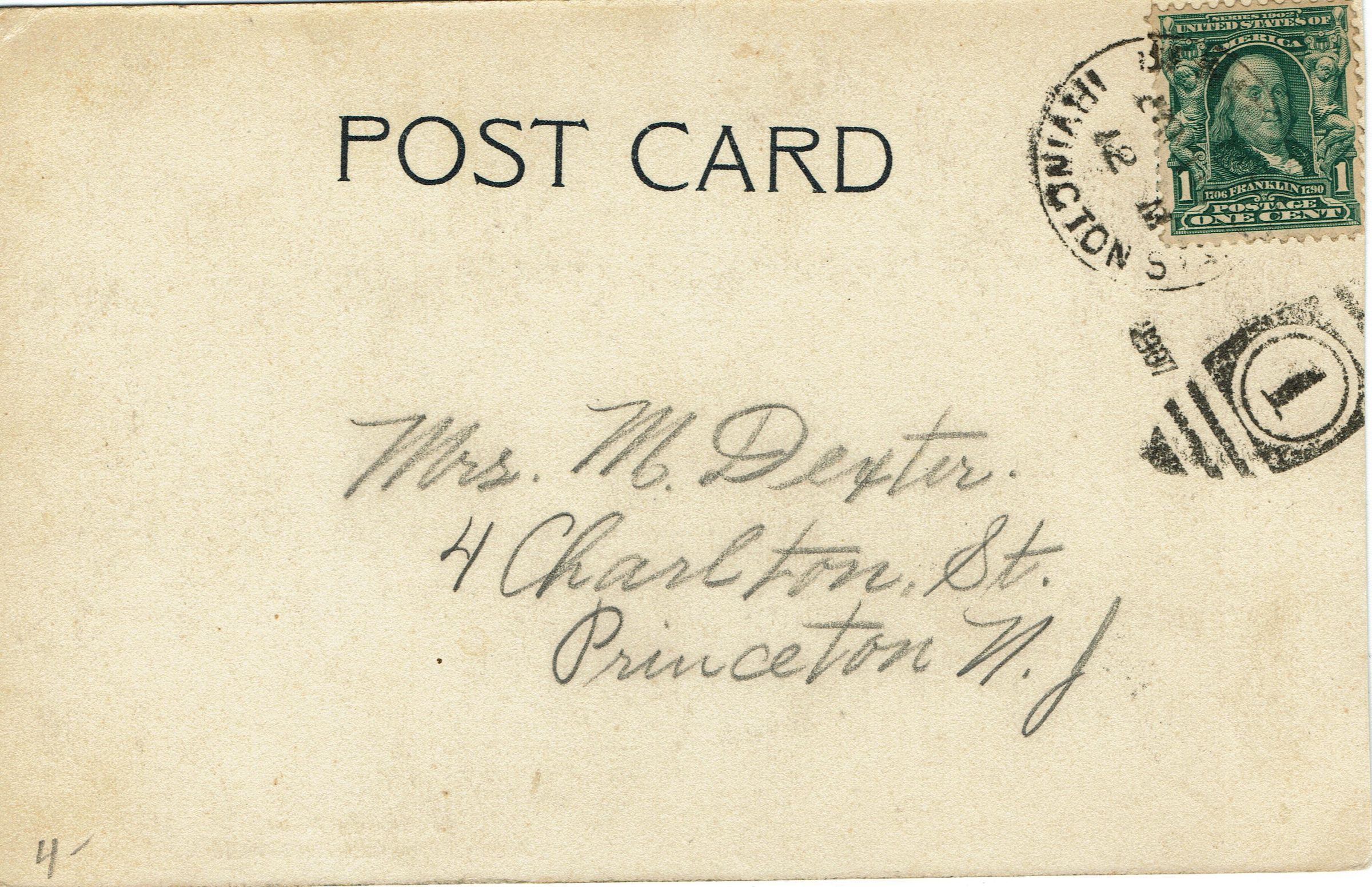 Postally used, postmarked Irvington (date unclear). Addressed to Mrs. M. Dexter, 4 Charlton Street, Princeton, NJ.Collection