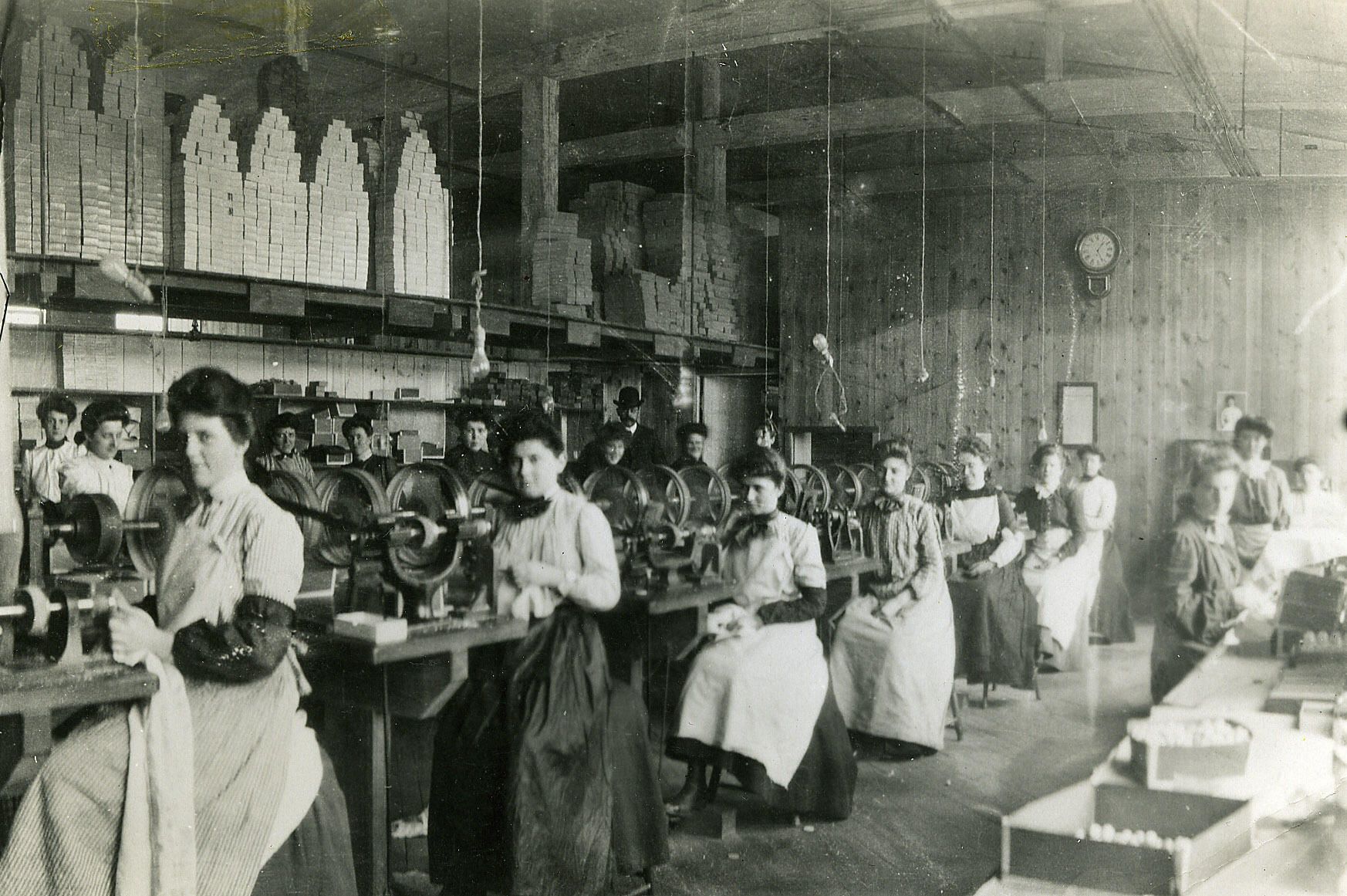 George Burt's Billiard Ball Factory was on the site of where South Mountain School is now located. The company was billed at the time as "the largest pool ball maker in America," and these employees were tasked with polishing and packing the billiard balls for shipment. All of the workers in the photo are women, with one man in a bowler hat visible in the back center. Factories were segregated by gender at this time, to ensure propriety. The man in the back served as a chaperone, entrusted with keeping any men from sneaking in.