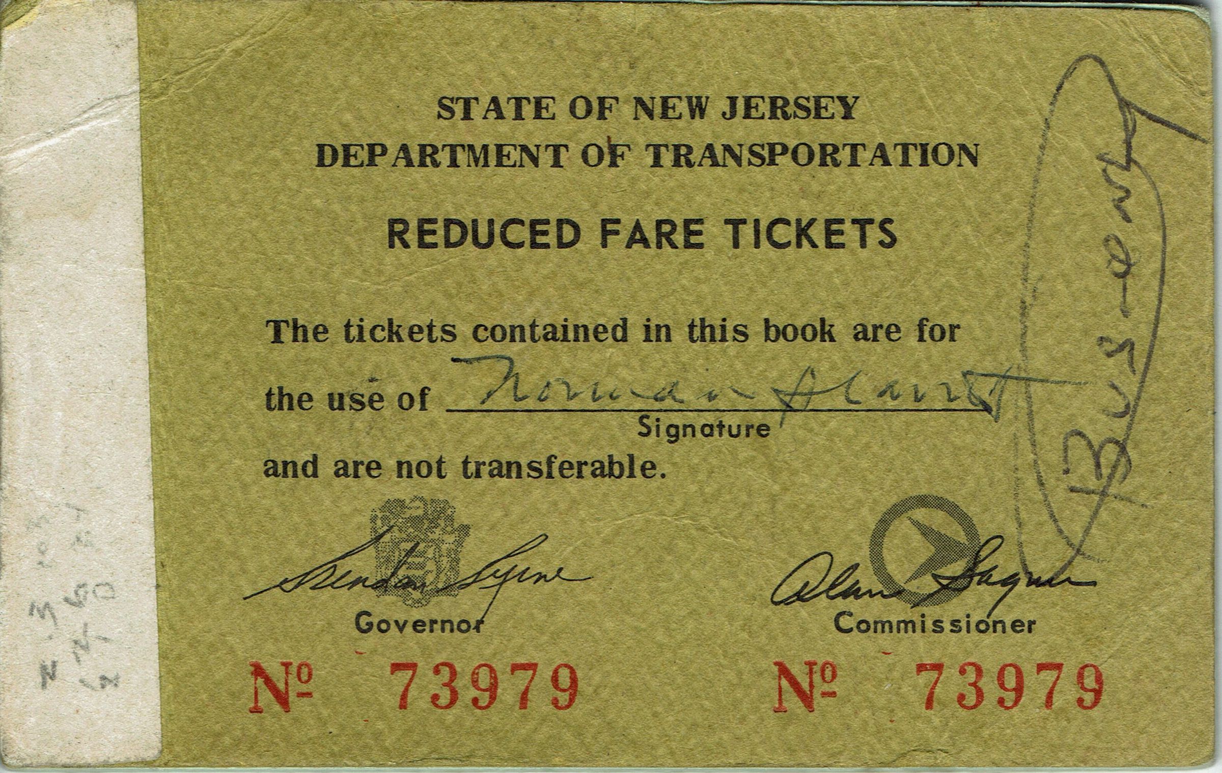 Booklet of Reduced Fare Tickets issued to Norman Slavitt from the State of New Jersey Department of Transportation. Partially used.Acquisition