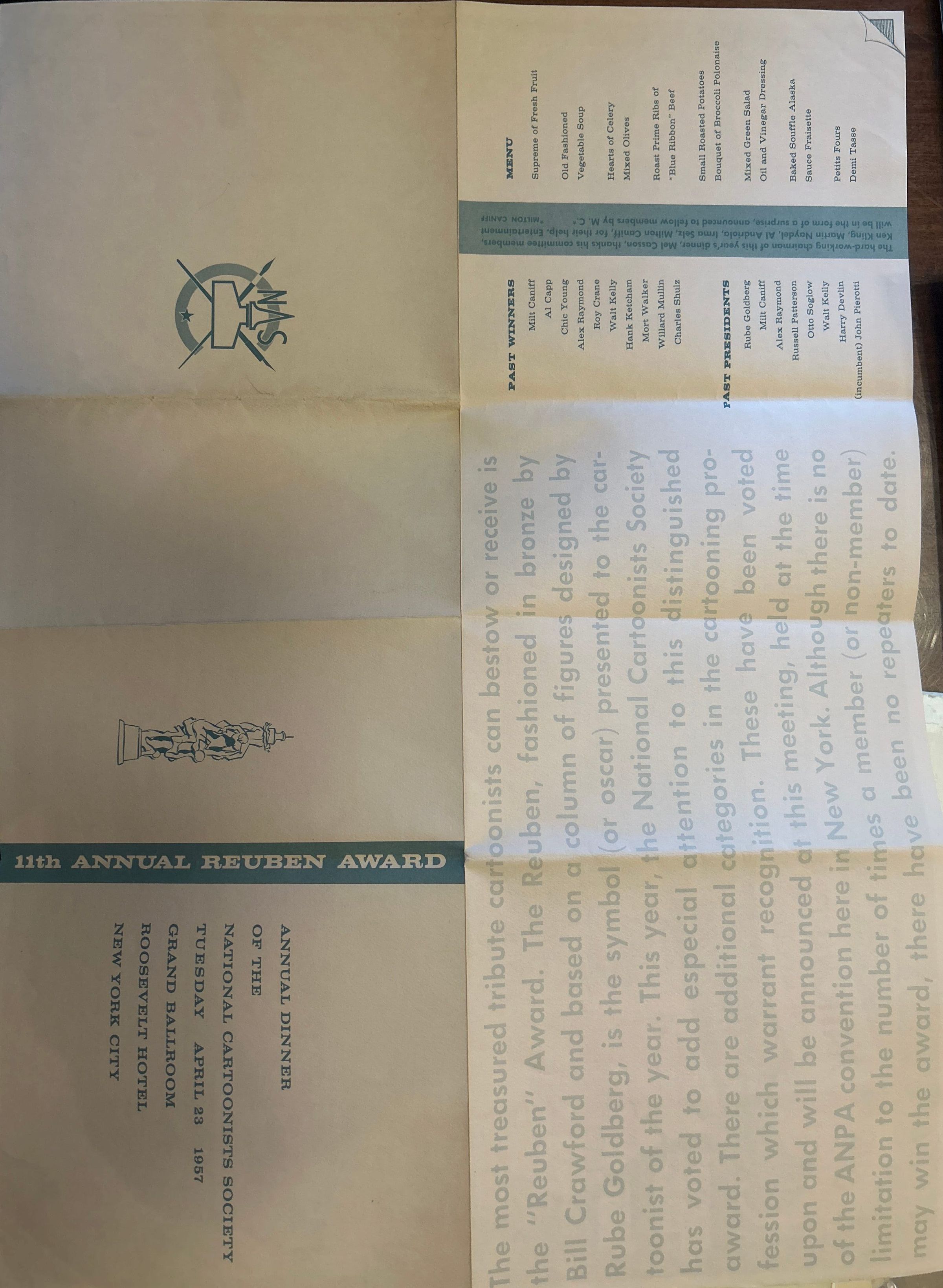 Program and menu from the National Cartoonists Society Dinner, Tuesday, April 23, 1957 at the Grand Ballroom of the Roosevelt Hotel, New York City.Acquisition