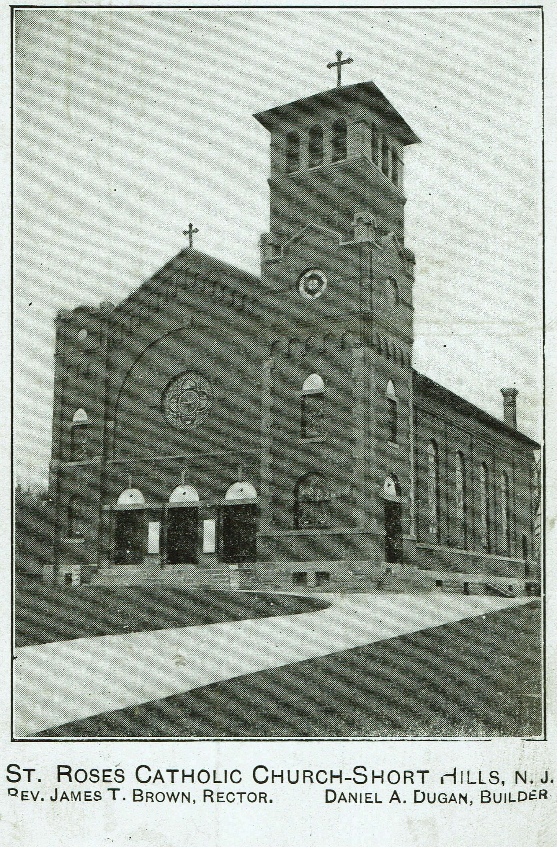 Reverend James T. Brown, Rector; Daniel A. Dugan, Builder. B&W photographic postcard of St. Rose of Lima Catholic Church on Short Hills Avenue. The image shows the 1909 brick church, which replaced the wooden building transported to Short Hills from Springfield in 1880.Collection