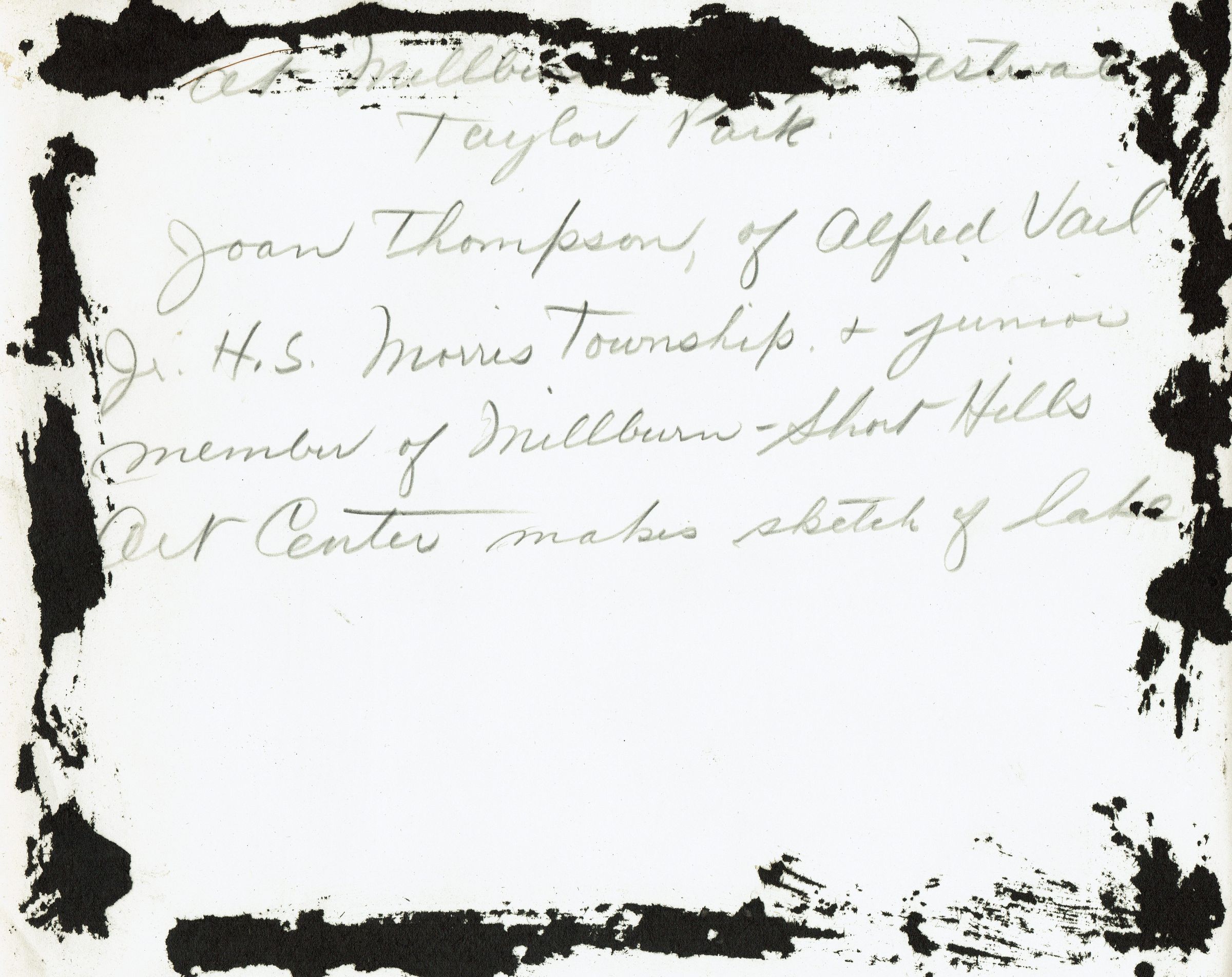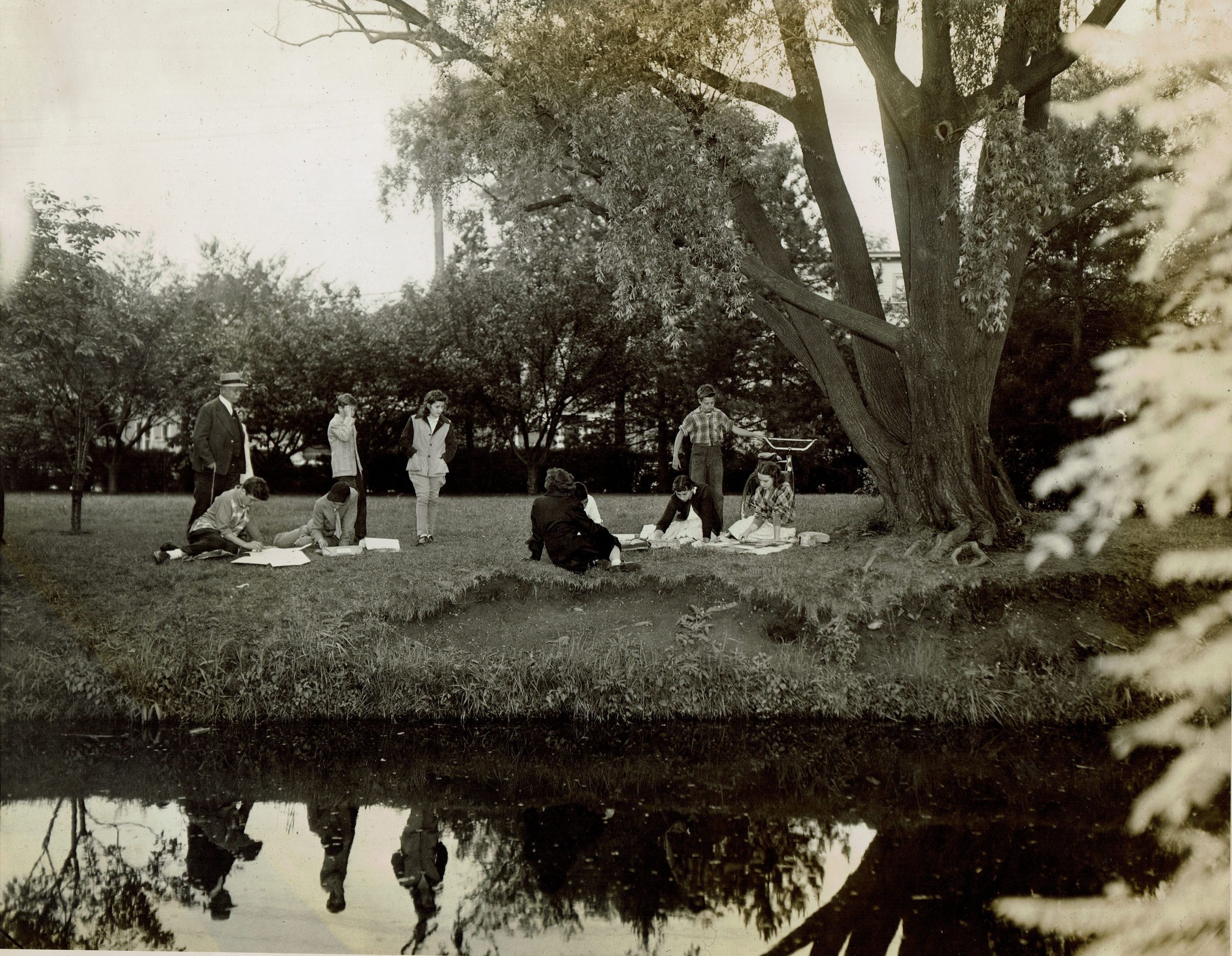 Three photographs of art activities in Taylor Park from the second annual Village Festival, sponsored by the Millburn Art Center on June 2 & June 9, 1945. Inscriptions on the verso of photographs read: Joan Thompson of Alfred Vail Junior High School, Morris Township and junior member of Millburn-Short Hills Art Center makes sketch of lake; Joan Price of Alfred Vail High School, Morris township and junior member of Millburn-Short Hills Art Center sketches from tree. No inscription on the verso of third photograph.Collection