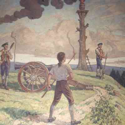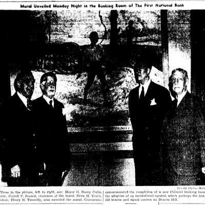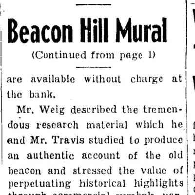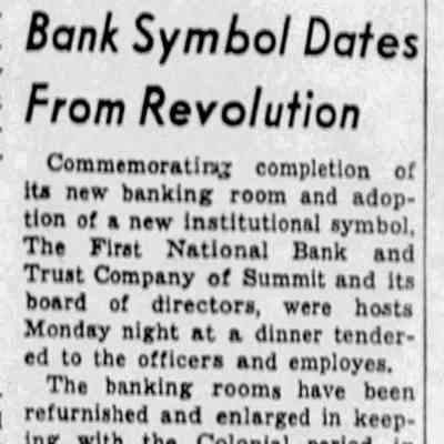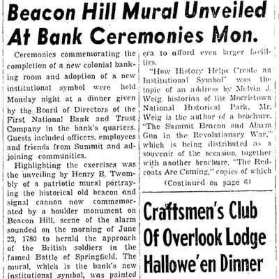 Photograph of Ernest N. Townsend's mural "Beacon of Protection and Community Service" depicting the Revolutionary War beacon painted in 1944 for The First National Bank and Trust Company of Summit (1 Maple Street). The photograph was taken by Harvey Reed in April 1975.Acquisition