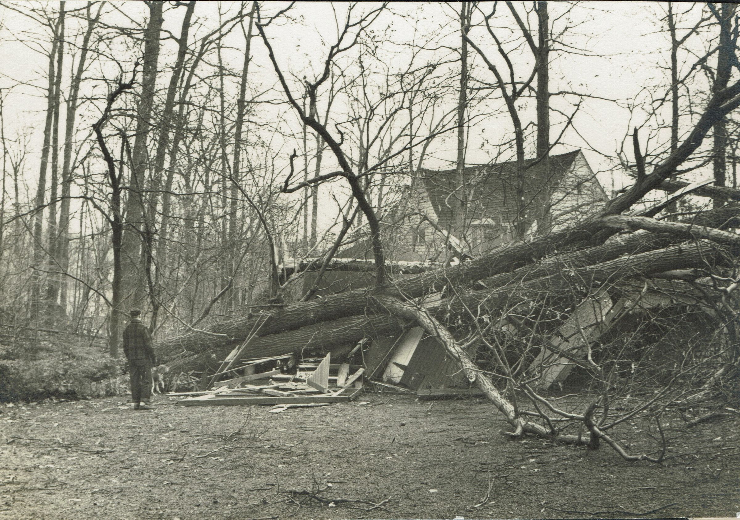 Photograph showing damage caused to Frederick McBride's garage on Delwick Lane from the Hurricane that hit Millburn November 24, 1950. Described as Millburn's worst storm (as compared to those of 1938, 1944 & 1948), the hurricane brought 100 mile/hour winds and caused extensive damage to homes throughout the township. For a detailed description of the storm, see the November 30, 1950 issue of The Item.Acquisition