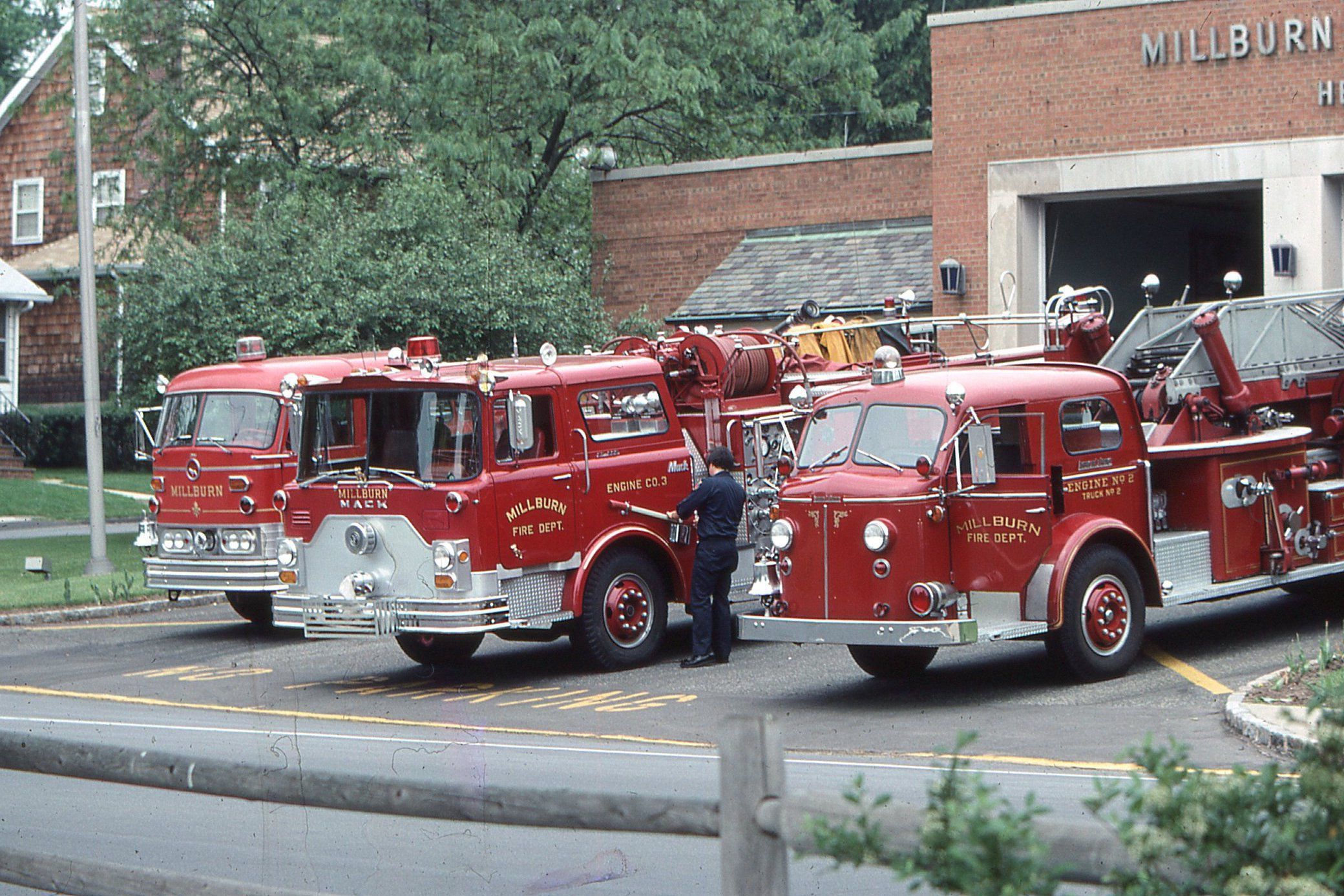 Photograph of three fire engines outside the Millburn Fire Station on Essex Street taken by John P. McNett in May 1976.Photograph Details