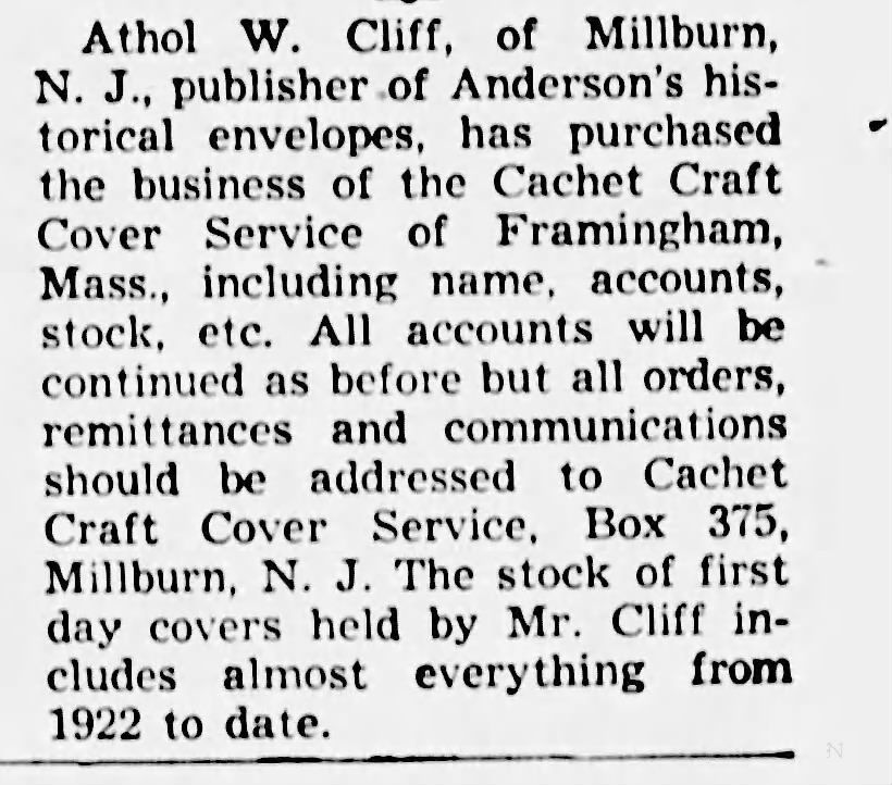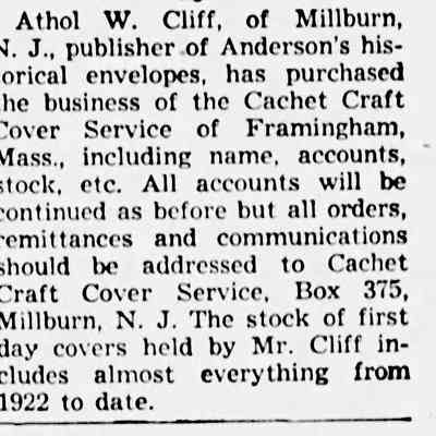 A 1969 first day cover envelope and card from Cachet Craft Cover Service, postmarked from Christmas, FL. From an online history of the business: "Athol and Virginia Cliff of Millburn NJ purchased Cachet Craft Cover Service from Frederick B. Fitts Co. in 1953. In 1971 Unicover Corporation of Cheyenne WY purchased Cachet Craft Cover Service from the Cliffs, and folded the Cachet Craft line into the Fleetwood brand of Cachets, which Unicover had purchased from Milnor and Travilla (Ioor) Peck in 1968, after the death of Travilla in 1967. The Last Cachet issued under the Cachet Craft brand was for Scott #1455, Family Planning, 3/18/72. (Monty et al., First Cachets Revealed, 2006, p. 85)."Acquisition