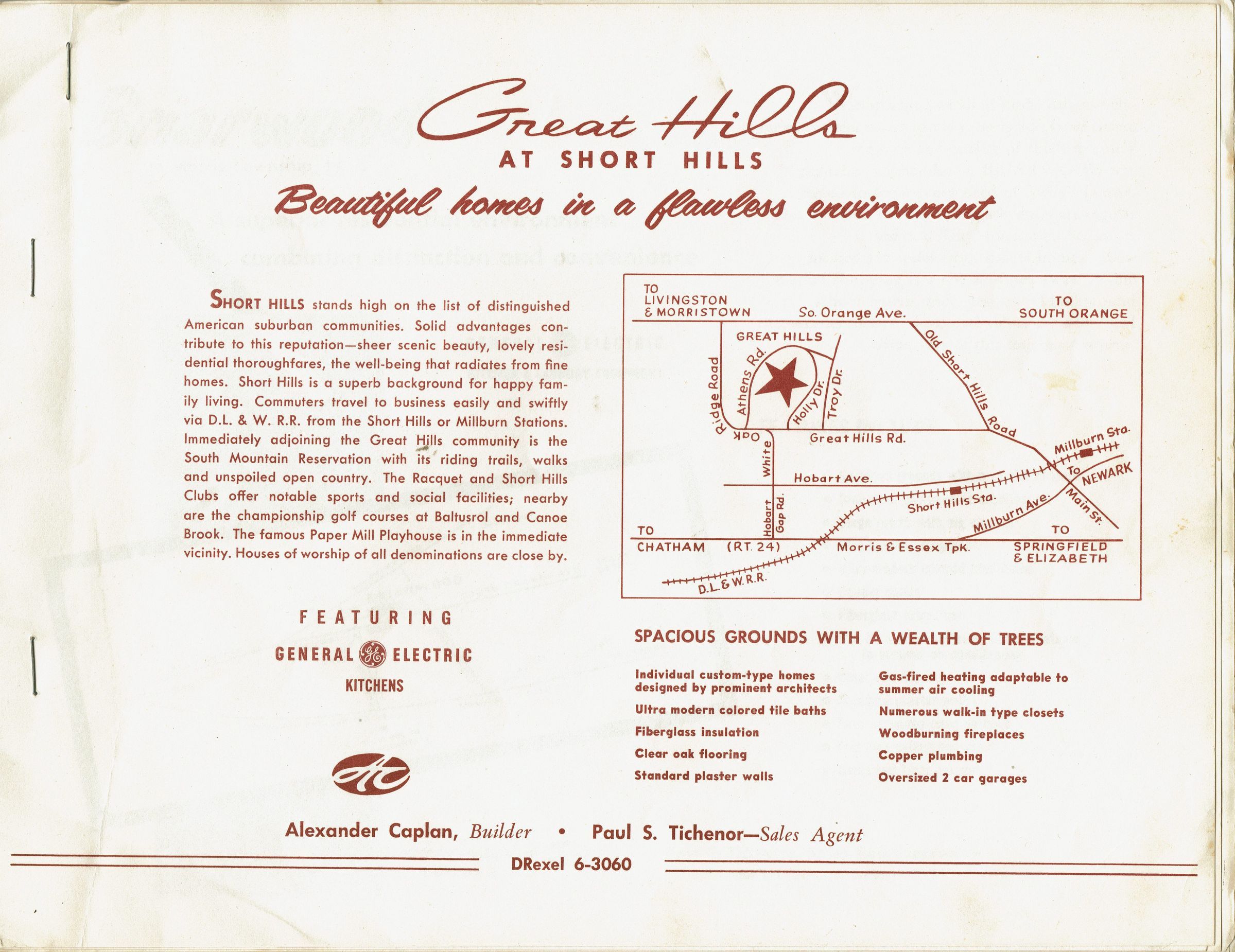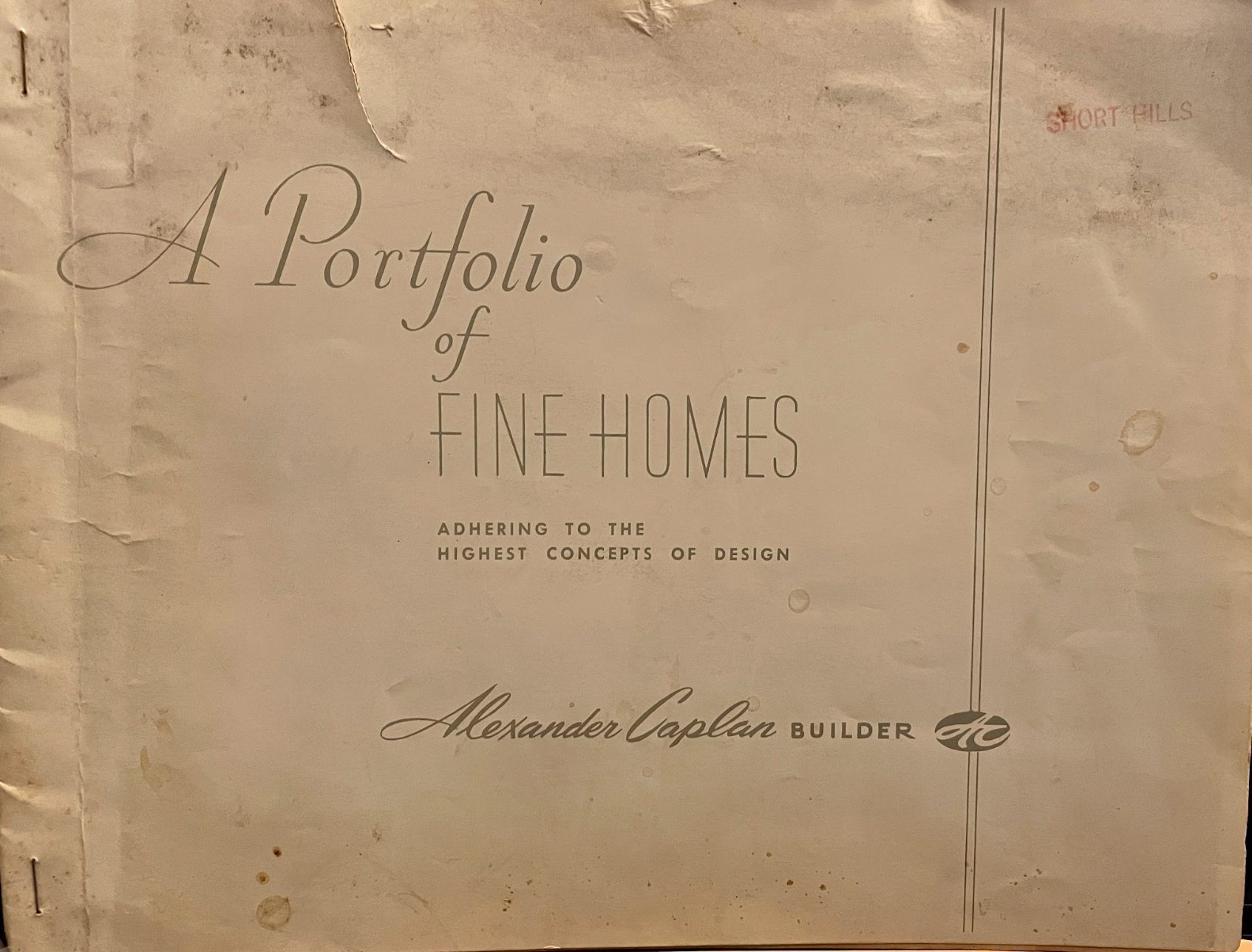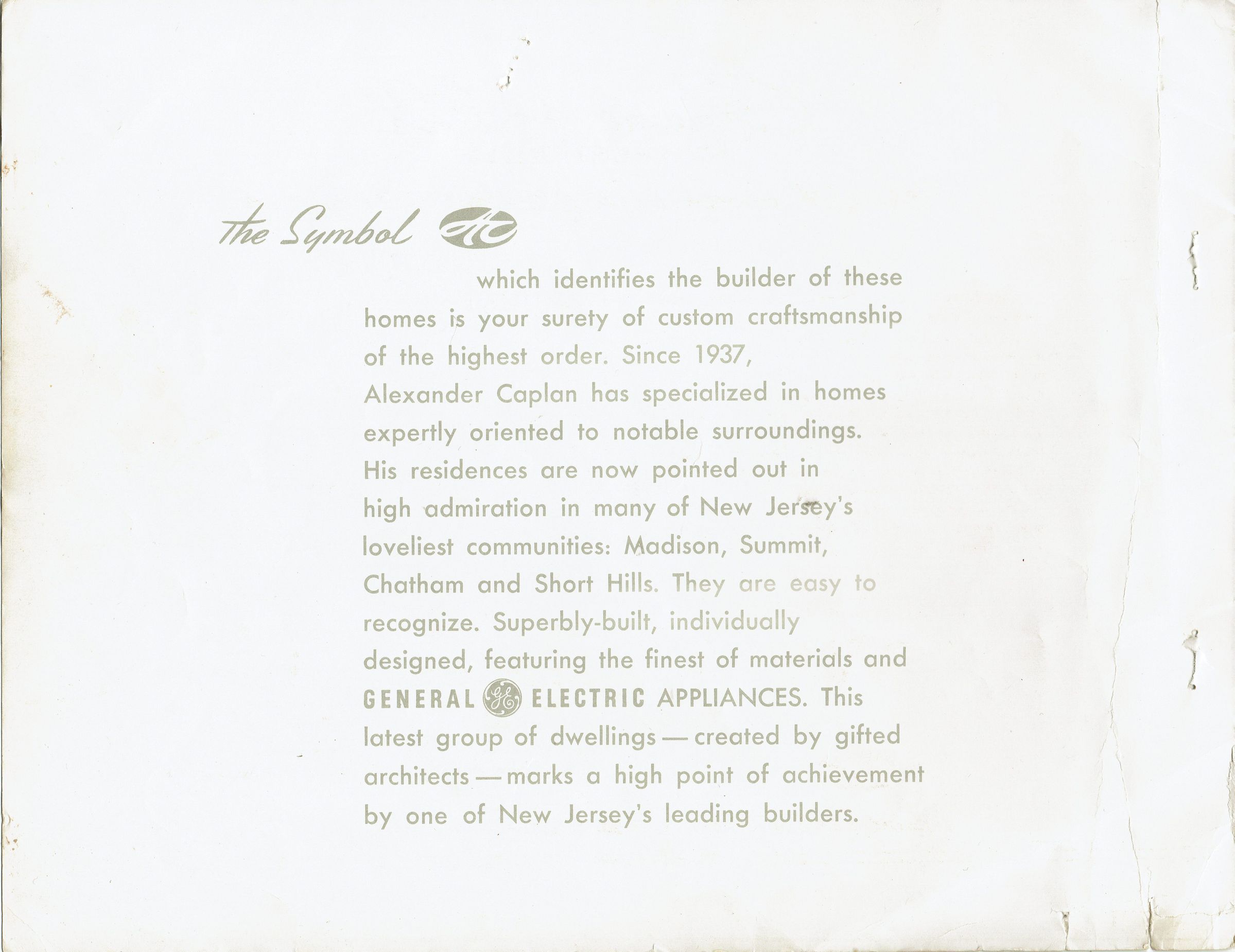 A Portfolio of Fine Homes: Adhering to the Highest Concepts of Design, by Alexander Caplan. Each page has one house built by Alexander Caplan, and the description, price, and structure of it are written. Promotional book for the Caplan's Developments in Morris Township, Chatham and the Great Hills Development in Short Hills. Alexander Caplan, Paul S. Tichenor, Sales Agent. 50 pp., unpaginated. Illustrated with plans and B&W photographs. Houses all feature GE Appliances. Houses were designed by Walter C. Pfeiffer and William G. Chirgotis. Includes prices.Acquisition