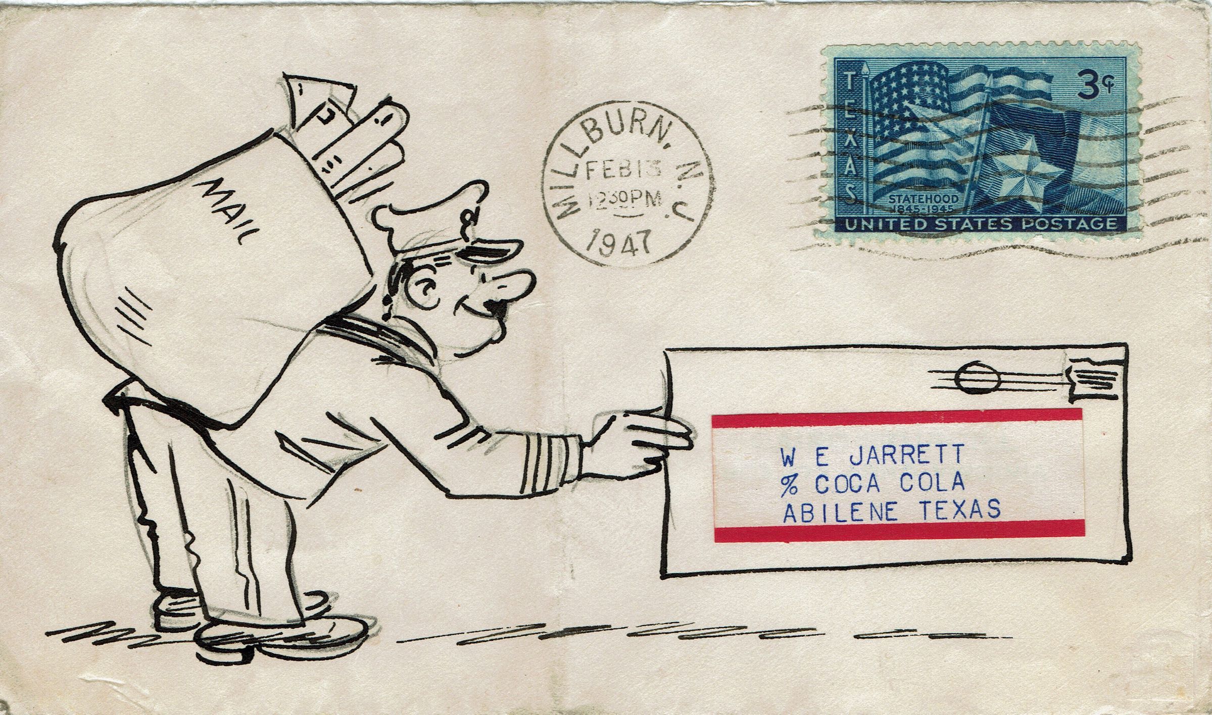 Sketch of a mailman holding an envelope on an envelope postmarked Millburn, February 13, 1947, 12:30 pm. Envelope has an address label for W.C. Jarrett, % Coca Cola, Abilene Texas.