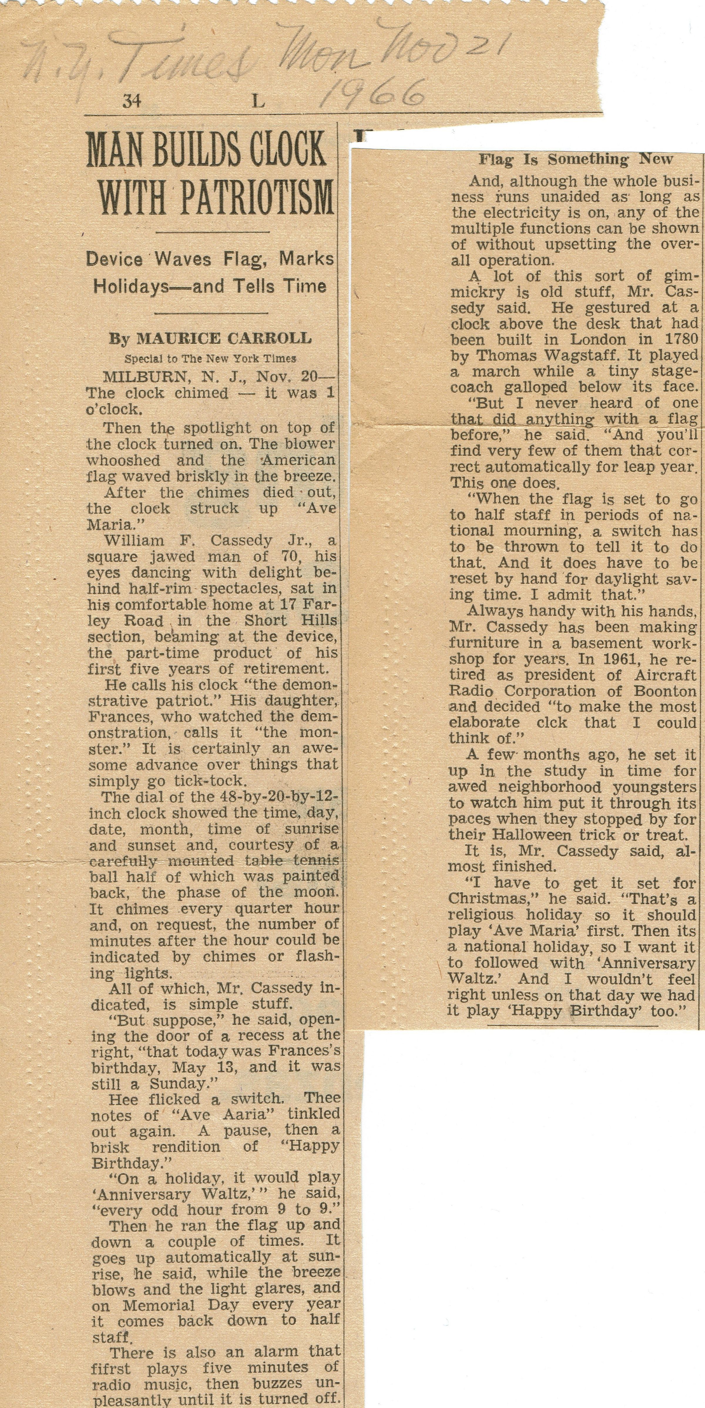 Article in the Monday, November 21, 1966 edition of The New York Times about William F. Cassedy, Jr. from Millburn and his patriotic clock invention. Cassedy was the former president of Aircraft Radio Corporation and lived at 17 Farley Road, Short Hills.Acquisition