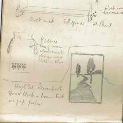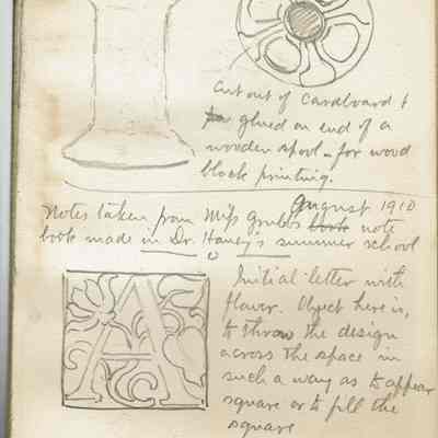Bonnie Snow's handwritten notebook with sketches on art education in primary schools. Brown paper cover, 32 pages.Collection