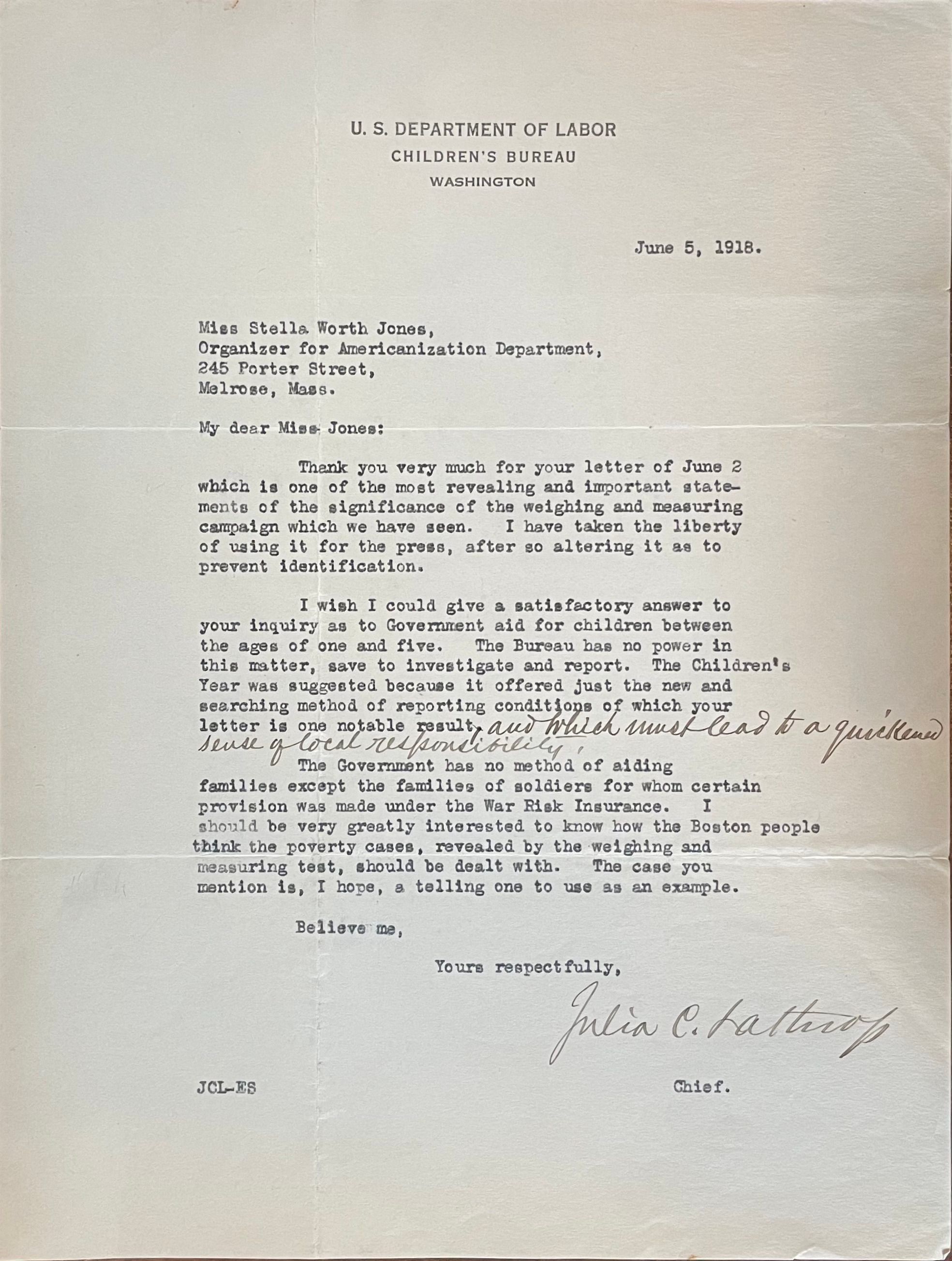 A letter from the US Department of Labor thanking her for her previous letter and responding to her inquiry regarding Government aid for children between the ages of one and five.