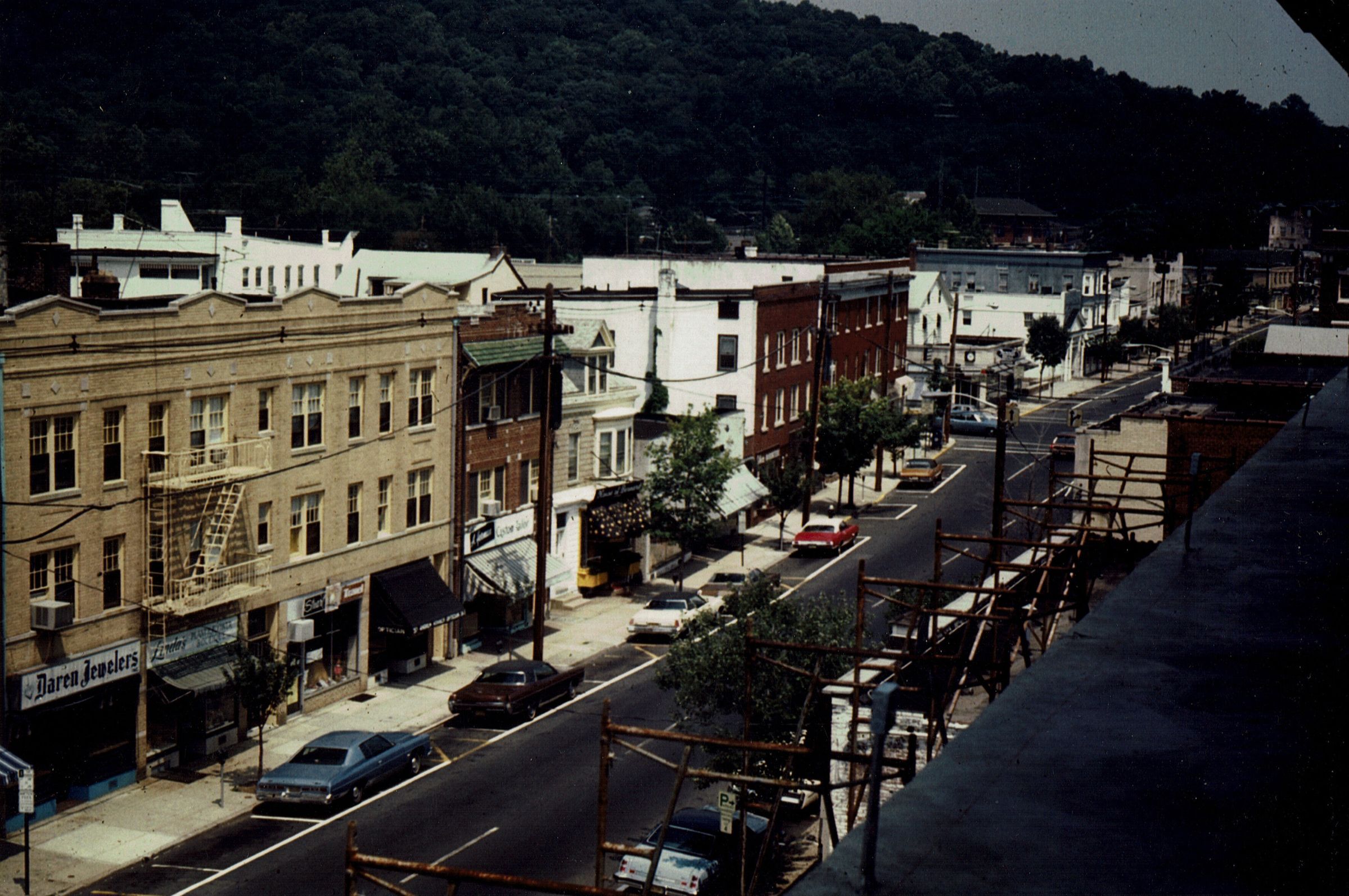 Photograph of Millburn Avenue looking east. The Millburn Train Station is visible in the distance on the right. Among the stores visible in the photograph are: Daren Jewelers, Linda's Boutique, Star Travel, and House of Bernard.Acquisition