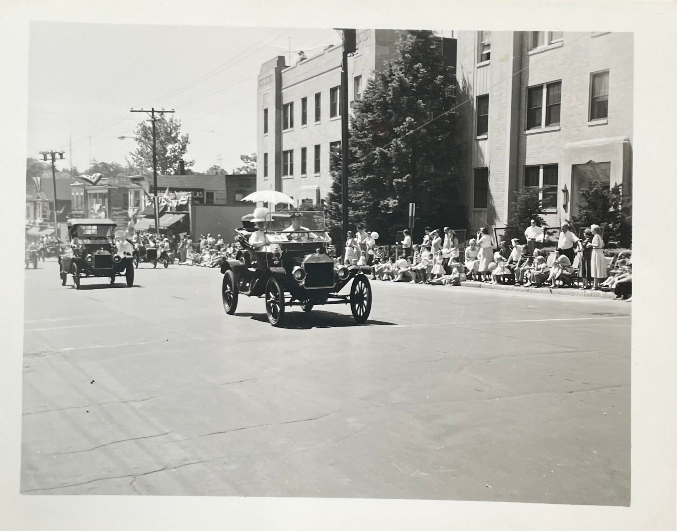 An image of two antique cars on Millburn Avenue at the Millburn Centennial Parade in 1957.Acquisition