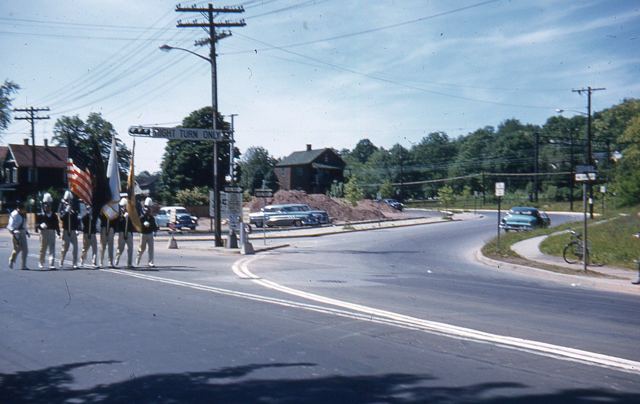 Photograph of the Knights of Columbus Color Guard from teh 1957 Millburn Centennial Parade at the intersection of Millburn Avenue and Essex Street.Photograph Details