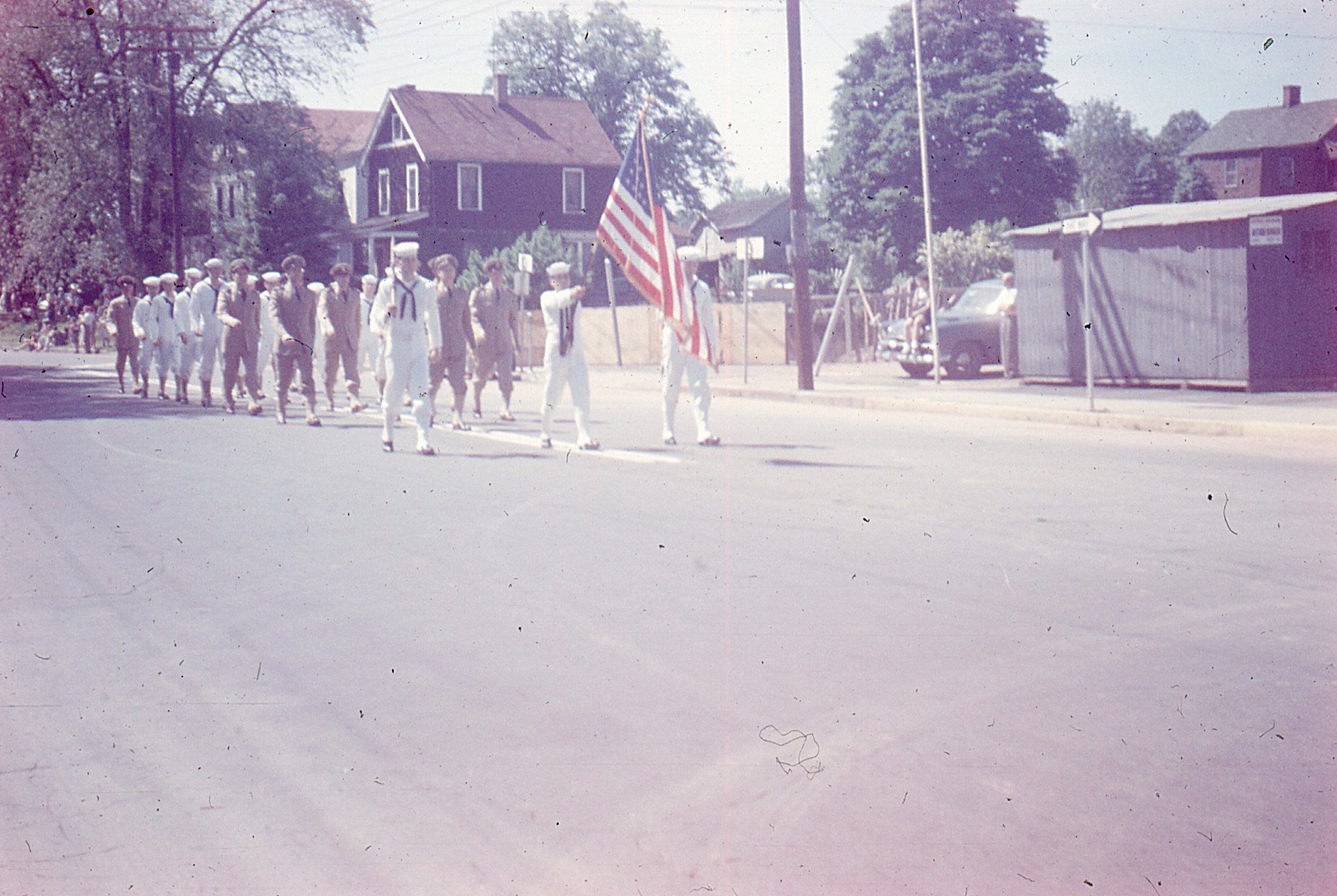 Photograph of members of the US Navy marching on Millburn Avenue near Essex Street in the 1957 Millburn Centennial Parade.Photograph Details