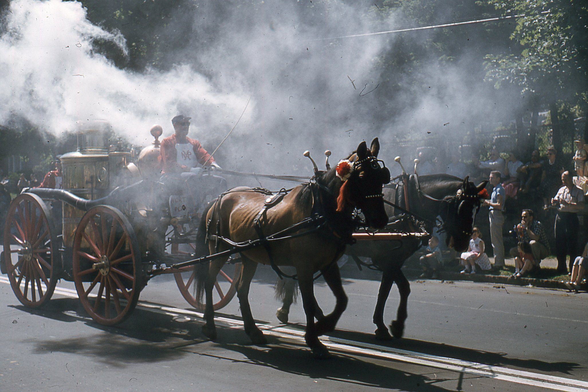 Photograph of the North Plainfield Fire Department's Horse-Drawn Steam Pumper from 1880 on Millburn Avenue near St. Stephen's Cemetery in the Millburn Centennial Parade on May 25, 1957.Photograph Details