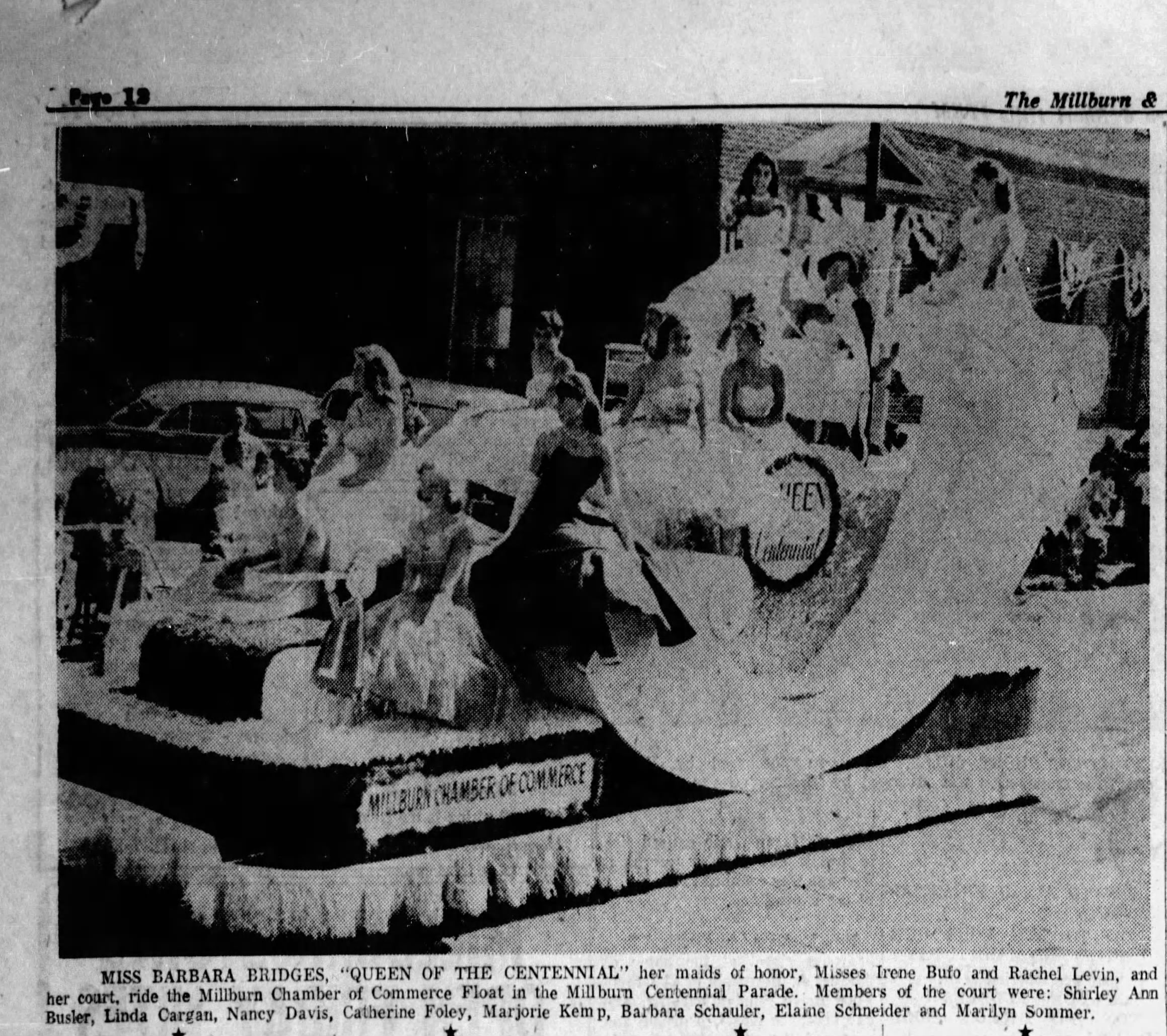 Photographs of the Queen of the Centennial Float at the 1957 Millburn Centennial Parade. The Queen of the Centennial was chosen via a contest sponsored by the Millburn Chamber of Commerce, which also sponsored the float. Barbara Bridges was crowned queen. Irene Bufo and Rachel Levin were awarded maids of honor. Members of her majesty's court, who appeared on the float were: Shirley Ann Busler, Linda Cargan, Nancy Davis, Catherine Foley, Marjorie Kemp, Barbara Schauler, Elaine Schneider and Marilyn Sommer.Photograph Details