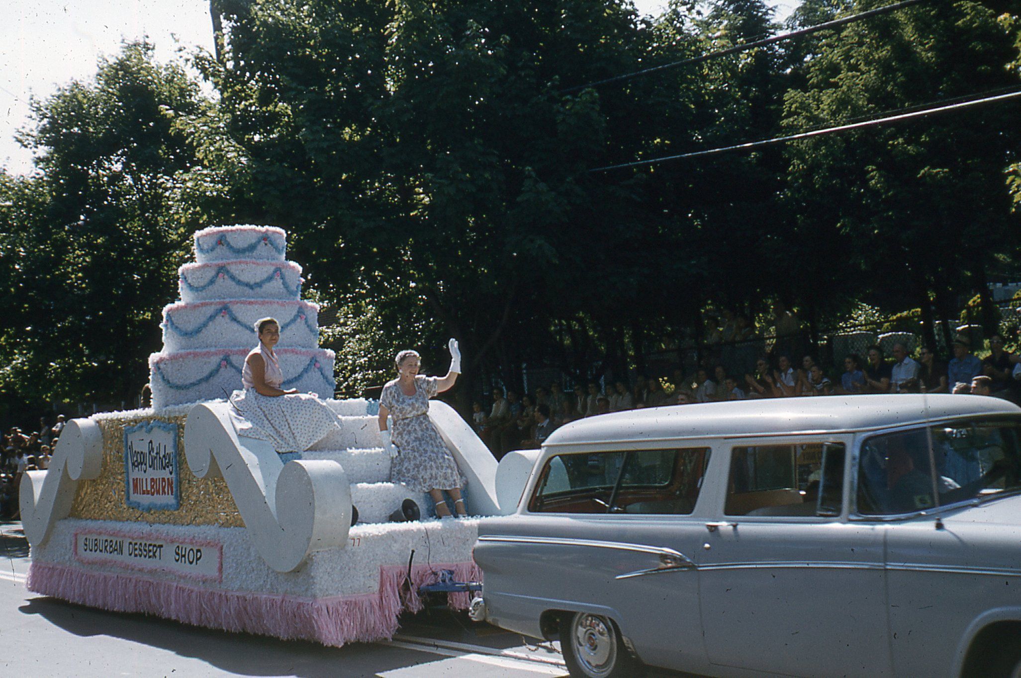 Photograph of the Suburban Dessert Shop's Float in the Millburn Centennial Parade, 1957.Photograph Details