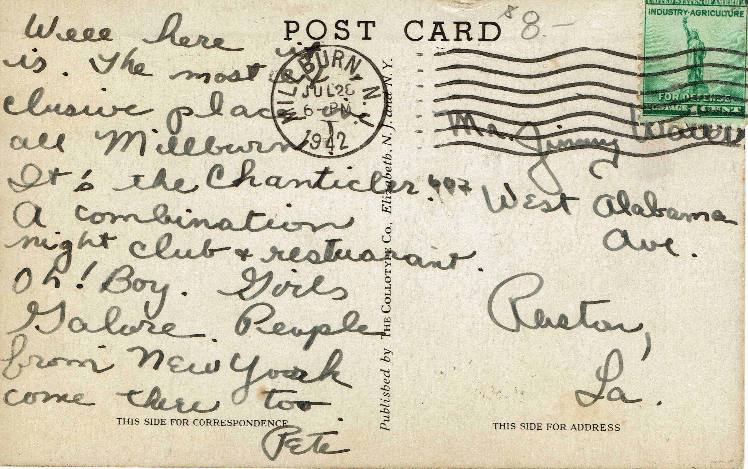 Postally used B&W photographic postcard of The Chanticler, Millburn. Postmarked Millburn, July 28, 1942, 6:00 pm. Card is addressed to Mr. Jimmy Walter, 607, West Alabama, Ave., Preston, La.